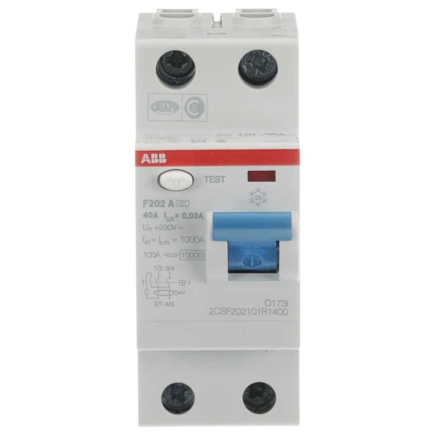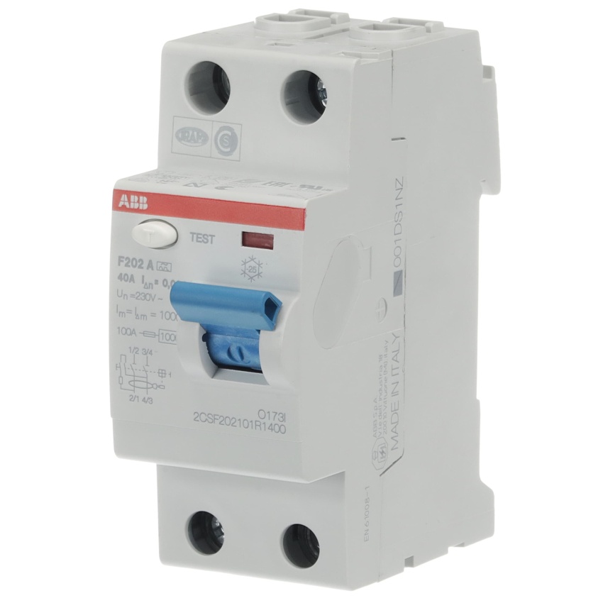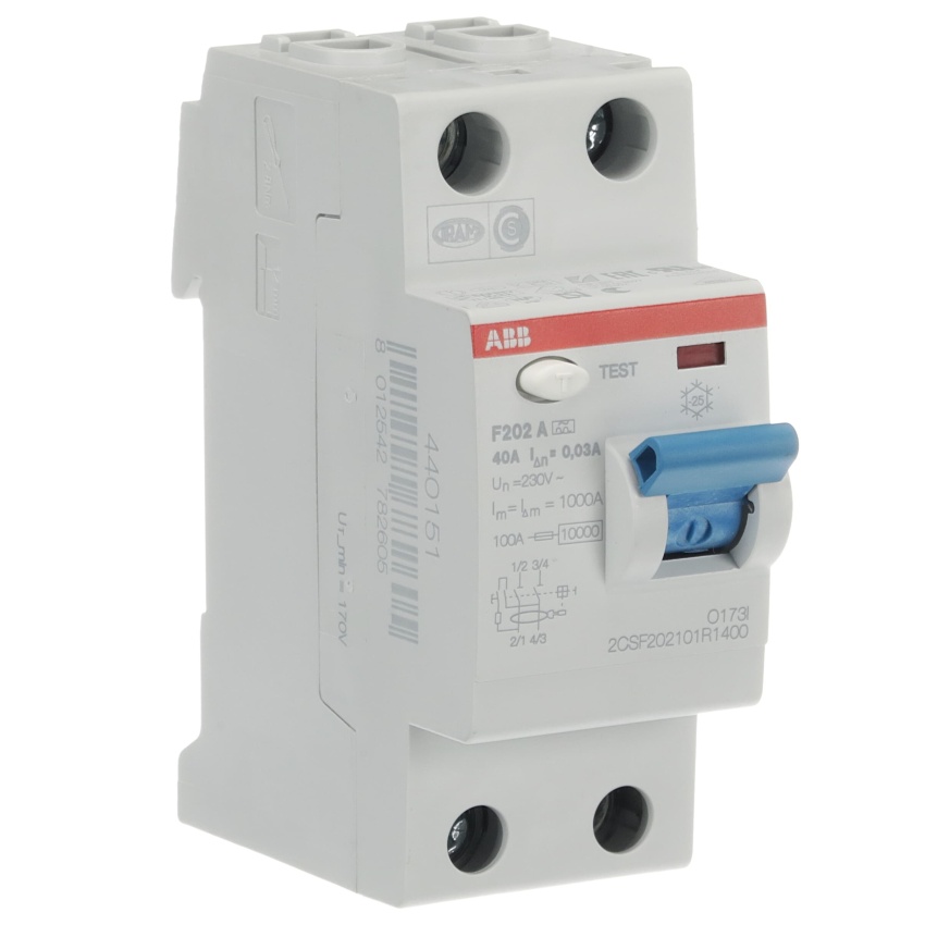 ABB F202A-40/0,03; proudový chránič; dvojpólový; jmenovitý proud: 40 A; citlivost: 30 mA; Typ A – pro střídavý a pulzující stejnosměrný reziduální proud (určeno pro 1f obvody s usměrňovači)