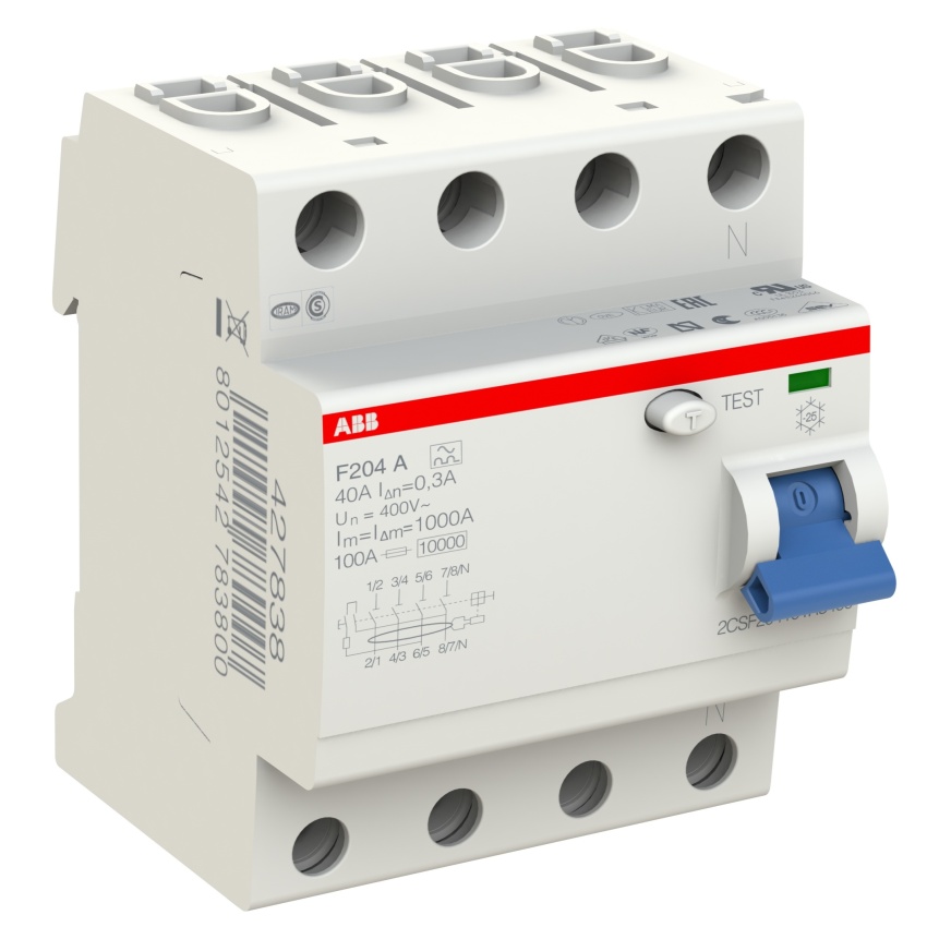 Proudový chránič řady F200, typ A. Funkce: ochrana proti vlivům zemních poruchových proudů střídavého proudu, sinusového průběhu, a stejnosměrného proudu pulzního průběhu; ochrana proti nepřímému dotyku a přídavná ochrana proti přímému dotyku (s citlivostí Idn = 30 mA). Použití: domácnosti, komerční a průmyslová sféra.