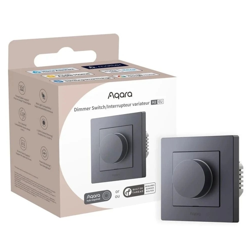 AQARA Dimmer Switch H2 EU (KD-R01D-G) nabízí ovládání osvětlení s podporou Zigbee 3.0 a Thread protokolů, což umožňuje integraci s ekosystémy Matter a Aqara. Vypínač podporuje žárovky, halogeny, stmívatelné LED a CFL s maximálním výkonem 300 W pro žárovky a halogeny a 200 W pro LED a CFL. Díky možnosti zapojení s neutrálním vodičem i bez něj je instalace flexibilní a jednoduchá. Otočný ovladač umožňuje plynulé nastavení jasu od 1 % do 100 % a integrovaný bezdrátový spínač slouží k zapnutí a vypnutí světla. Zařízení je kompatibilní s modulárními systémy System 55 a podporuje vícekanálové rámečky třetích stran jako Gira System 55 a Merten M.