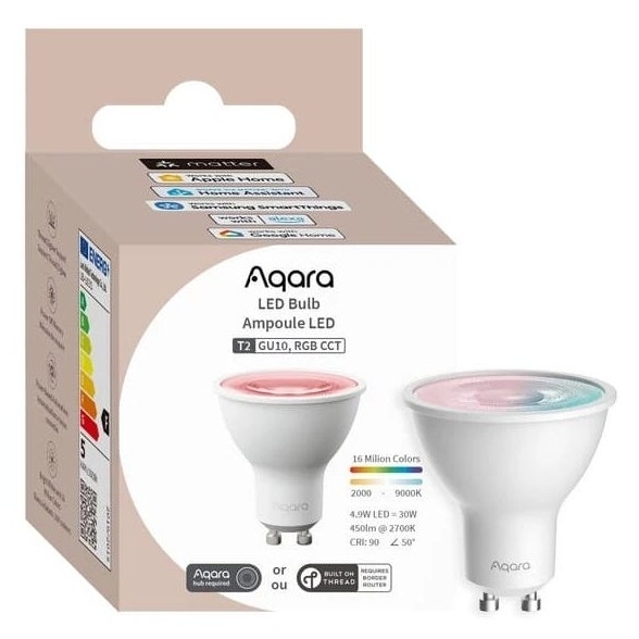 AQARA LED Bulb T2 (GU10, RGB CCT) (LB-L03D) nabízí široké možnosti osvětlení díky 16 milionům barevných odstínů a laditelné bílé barvě v rozsahu 2000-9000K. Žárovka podporuje bezdrátové protokoly Thread a Zigbee s možností snadného přepínání, což umožňuje integraci do různých smart domácností včetně Apple Home, Google Home a Alexa. S jasem 450 lm, úhlem vyzařování 50° a vysokým indexem podání barev Ra>90 zajišťuje kvalitní a realistické osvětlení pro každou příležitost.