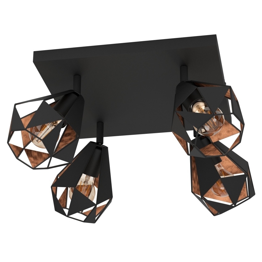 Stropní svítidlo EGLO CARLTON 7 vyniká kombinací černého kovu a měděného antického vnitřku stínidel. Čtyři pohyblivá stínidla ve tvaru kosočtverce umožňují nasměrovat světlo dle potřeby a vytvářejí fascinující světelné efekty díky geometrickým otvorům. Svítidlo je ideální pro kuchyň, obývací pokoj, ložnici či chodbu. Je určeno pro žárovky s paticí E27 a maximálním výkonem 40 W.