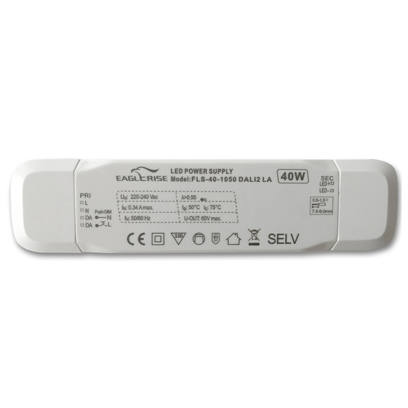 Regulovatelný SELV zdroj konstantního proudu k LED svítidlům Nova 350/400, řiditelný pomocí DALI nebo tlačítkem. Maximální výkon 40 W, PF 0,95, výstupní napětí DC9-52V, výstupní proud max. 1050mA. Rozměry 186x45x30 mm, IP20, materiál plast. Zdroj disponuje integrovanou ochranou proti zkratu, přetížení i přehřátí. Lze nastavit konkrétní max. hodnotu výstupního proudu.