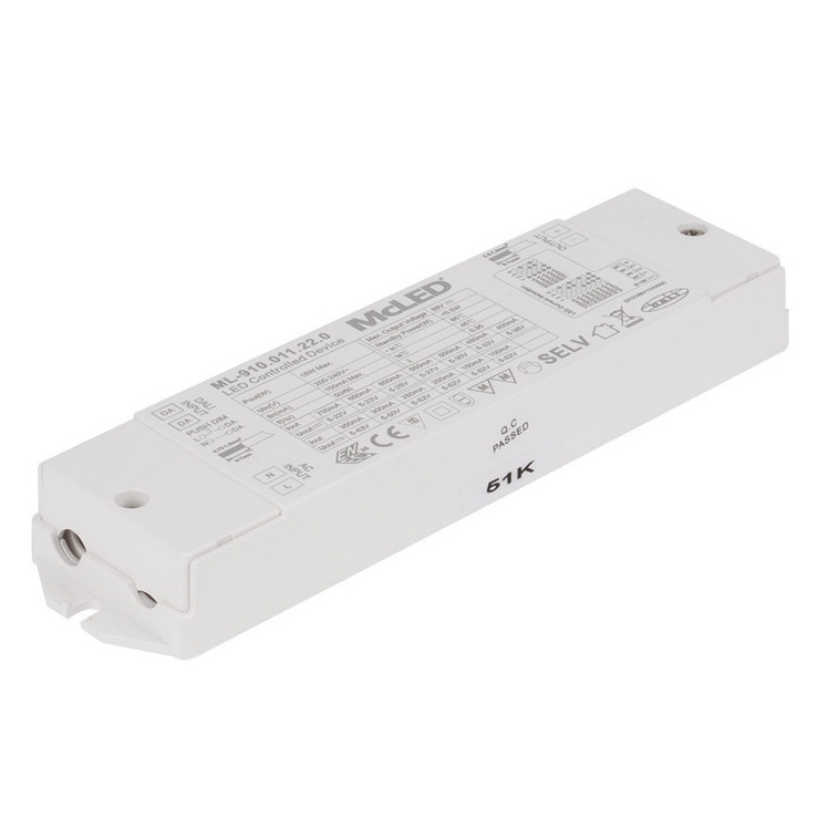 Kompaktní stmívatelný driver s výstupním výkonem 15 W a napětím 5–52 V DC je vhodný pro konstantní napájení LED svítidel, zejména řady McLED Toro 9 W a 15 W. Nabízí řízení jasu pomocí DALI systému nebo funkce Push-DIM (stmívání tlačítkem). Nastavitelný výstupní proud v rozsahu 100–700 mA umožňuje přizpůsobení konkrétní LED aplikaci. Vhodné pouze pro vnitřní použití.