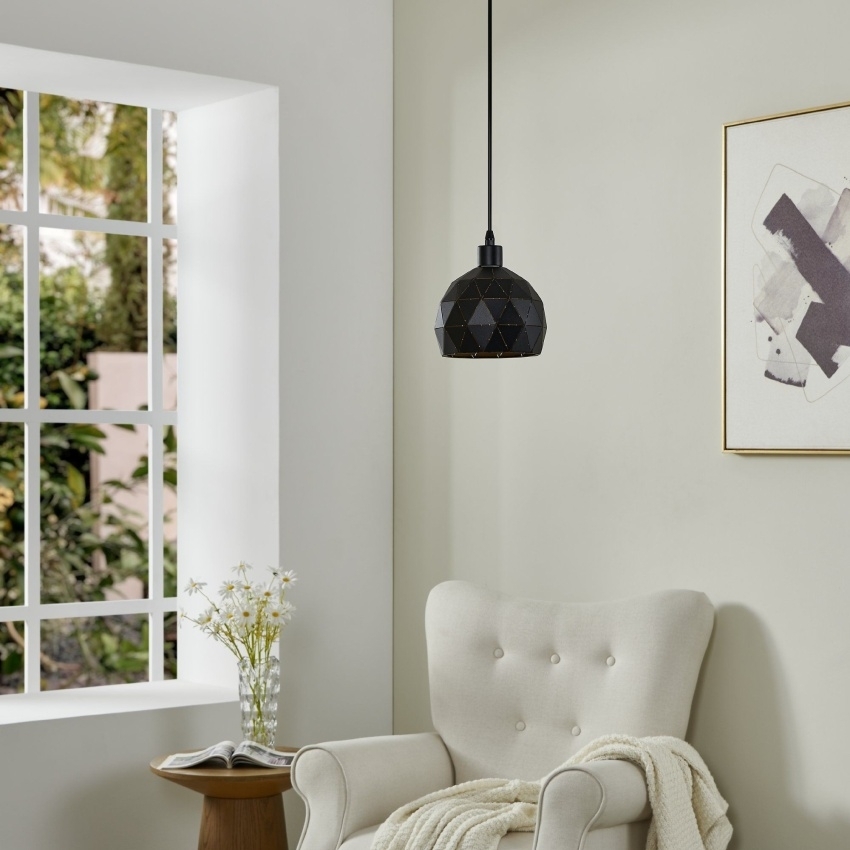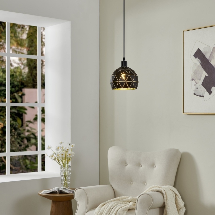 Závěsné svítidlo EGLO ROCCAFORTE je vyrobeno z černých kovových trojúhelníků poskládaných do tvaru polokoule. Díky zlatému vnitřku a otvorům mezi jednotlivými částmi vytváří po rozsvícení jedinečný světelný efekt. S průměrem 17 cm a výškou až 110 cm je ideální volbou pro osvětlení jídelního stolu, barového pultu, obývacího pokoje, ložnice nebo vstupní haly. Svítidlo je vhodné pro žárovku s paticí E14 a maximálním výkonem 40 W (není součástí balení).