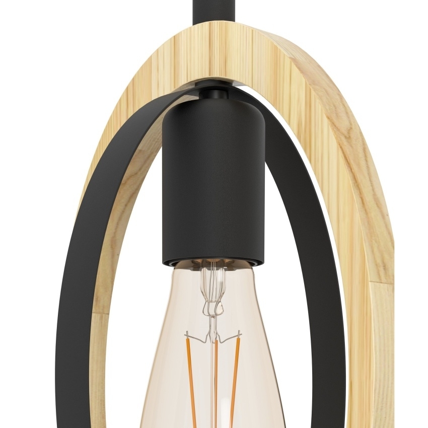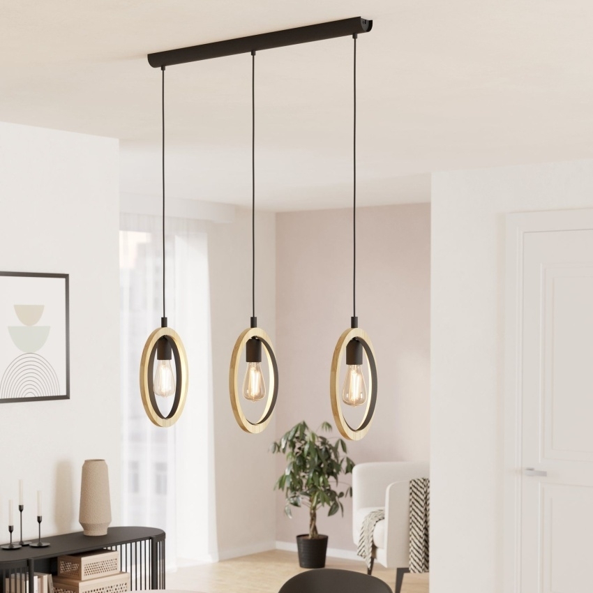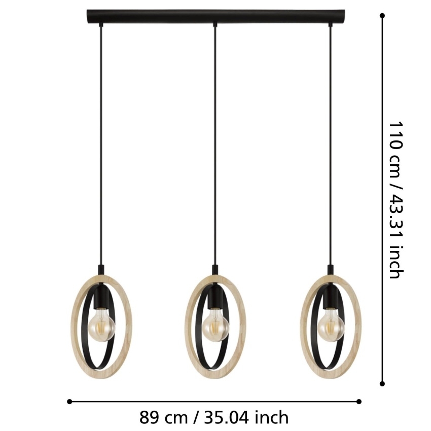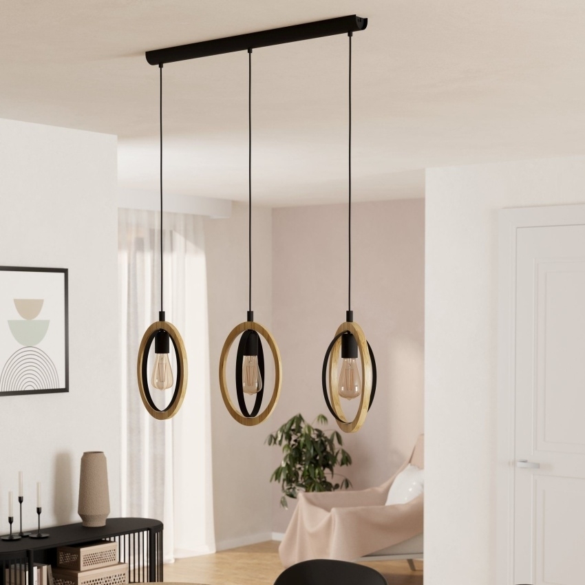 Stylové závěsné svítidlo Eglo BASILDON z černého kovu a hnědého dřeva, se třemi paticemi E27.