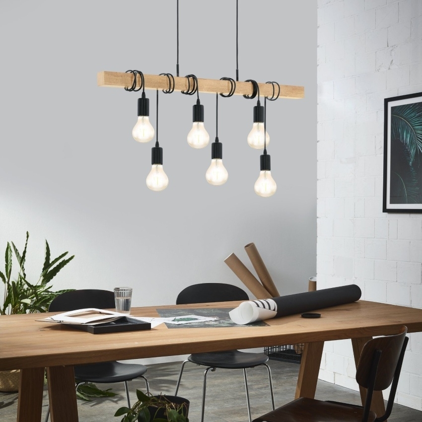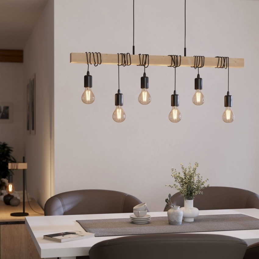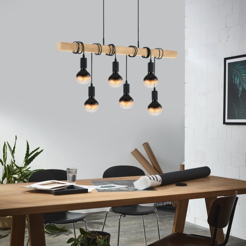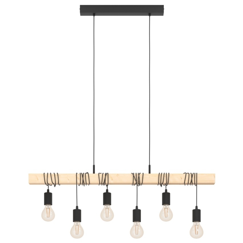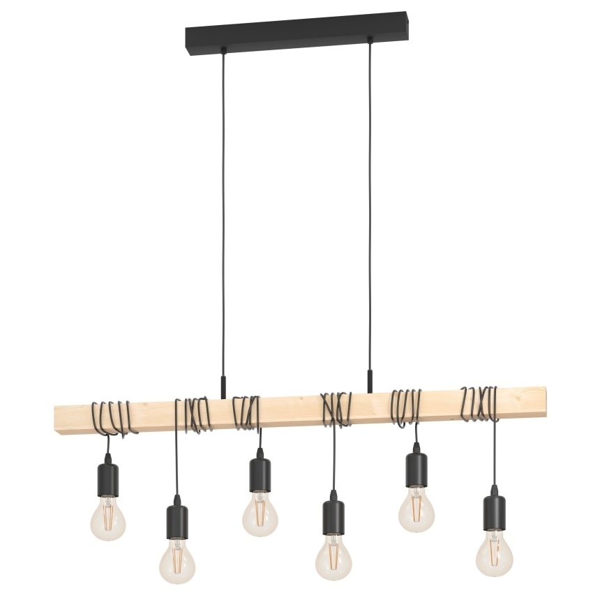 Závěsné svítidlo EGLO TOWNSHEND kombinuje černý kov s přírodním borovicovým dřevem, čímž vytváří jedinečný vintage industriální styl. Dřevěný trám slouží jako základna pro šest zavěšených objímek, které lze různě výškově nastavit. Ideální pro osvětlení jídelního stolu, obývacího pokoje či dalších moderních interiérů.