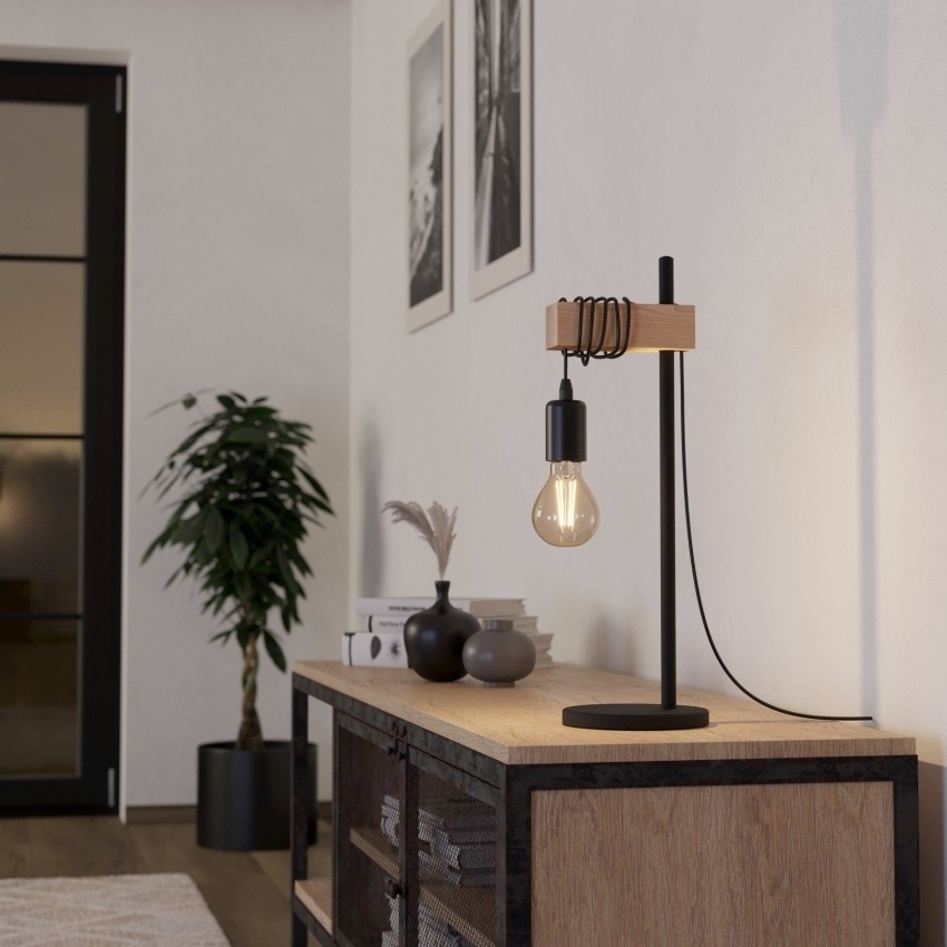 Stolní lampa EGLO TOWNSHEND je originální designový prvek spojující přírodní borovicové dřevo s černým kovem. Díky jednoduchému zavěšení objímky lze nastavit její výšku podle potřeby. Skvěle se hodí do obývacího pokoje, pracovny nebo ložnice a perfektně zapadá do vintage a industriálního stylu interiéru. Žárovka s paticí E27 není součástí balení.
