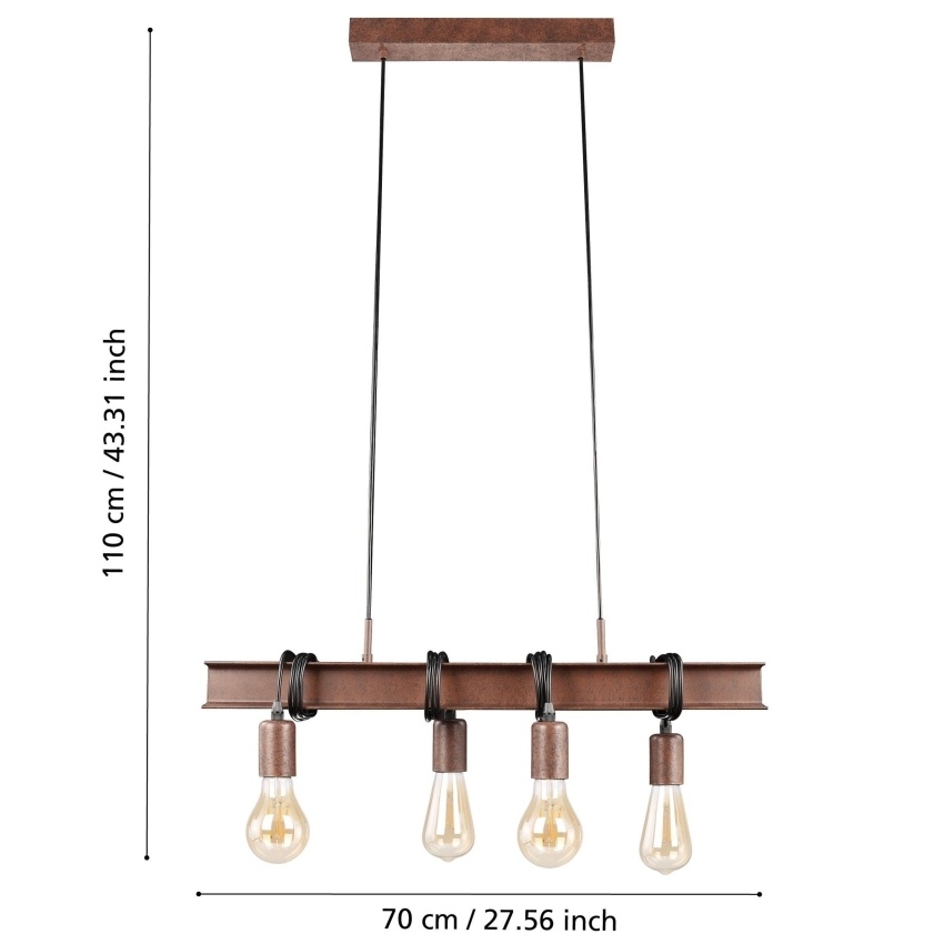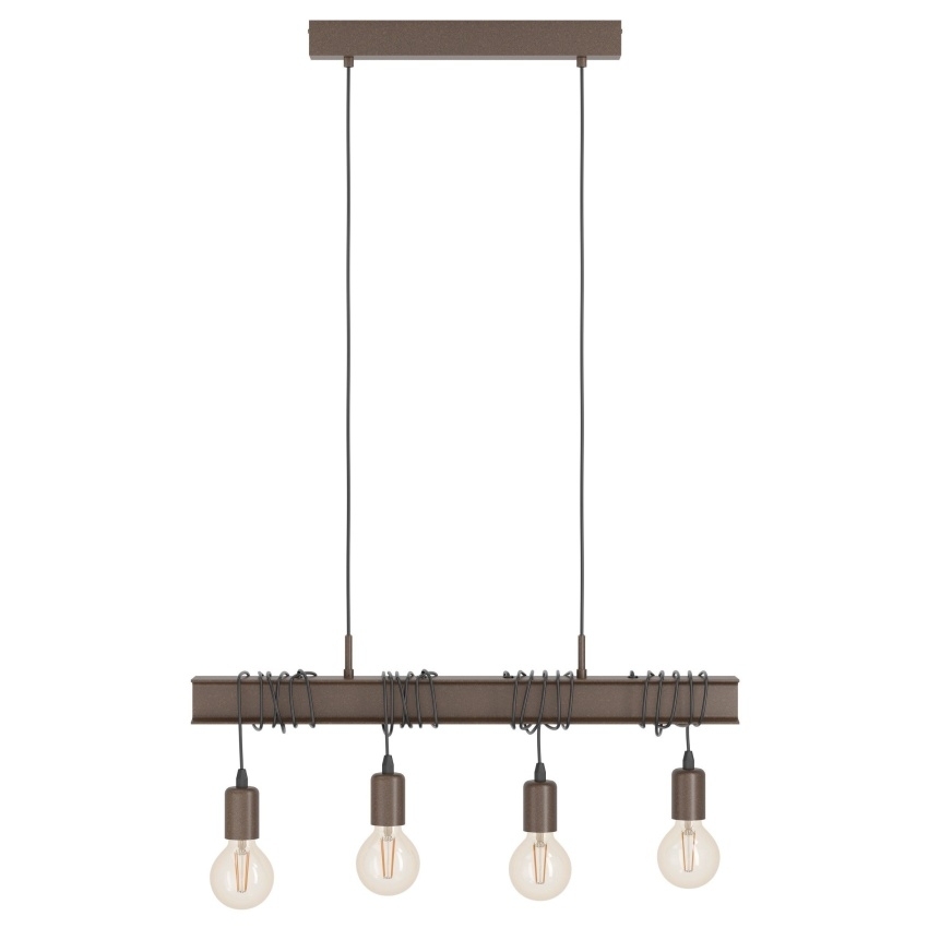 Závěsné svítidlo EGLO TOWNSHEND 4 přináší industriální design v antické hnědé barvě. Díky dlouhým kabelům lze každou žárovku spustit do jiné výšky a vytvořit tak originální a jedinečný vzhled osvětlení. Skvěle se hodí do kuchyně, jídelny, obývacího pokoje, ložnice či pracovny a zajímavě doplní i vstupní halu, chodbu nebo schodiště. Žárovky s paticí E27 nejsou součástí balení.