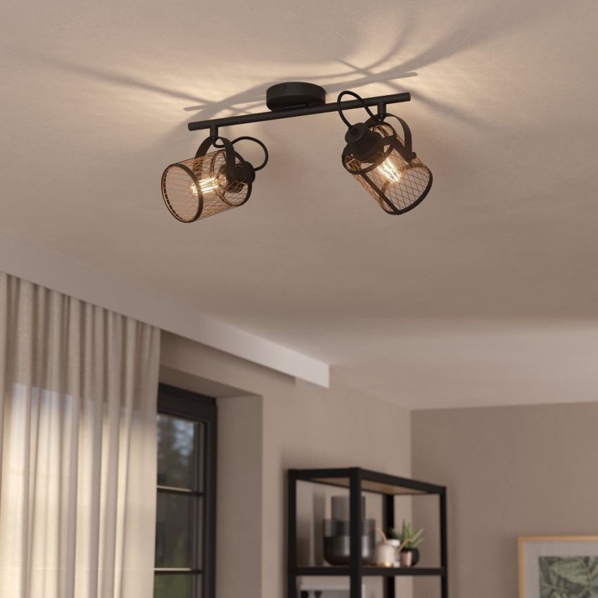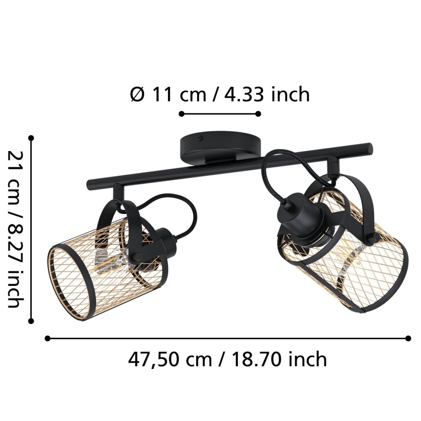 Bodové svítidlo EGLO DELLOW zaujme elegantní kombinací černé barvy a mosazné mřížky kolem žárovek, které jsou součástí designu. Dvě pohyblivé hlavice umožňují nastavit směr osvětlení dle potřeby. Svítidlo lze instalovat na strop nebo stěnu, ideální je pro osvětlení kuchyně, chodby, obývacího pokoje či pracovního koutu. Žárovky s paticí E27 nejsou součástí balení.