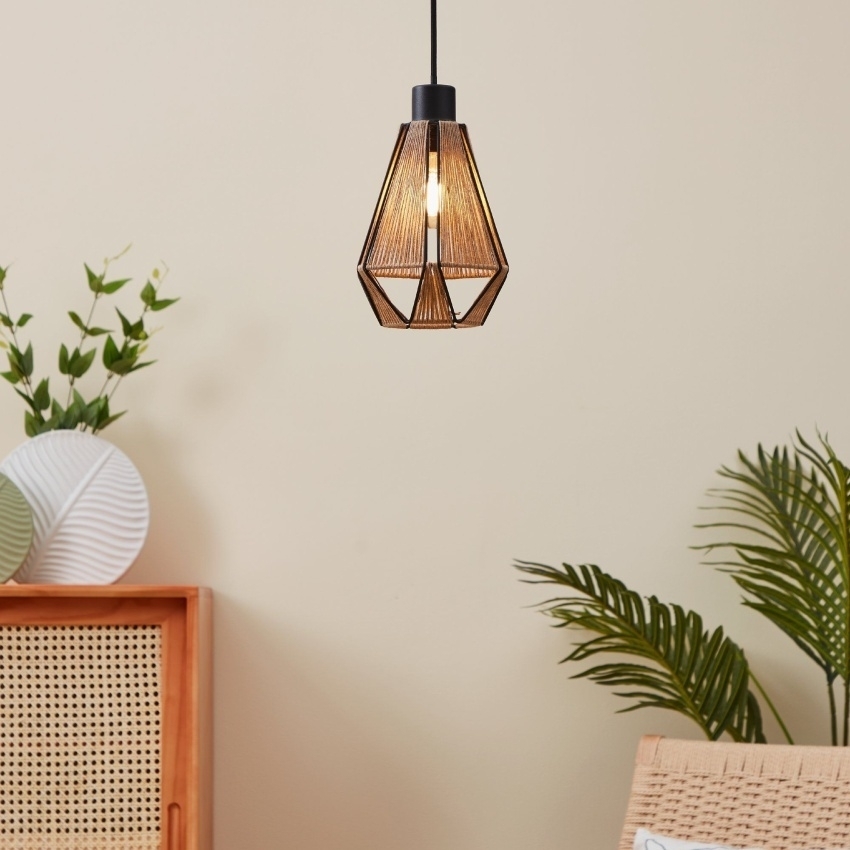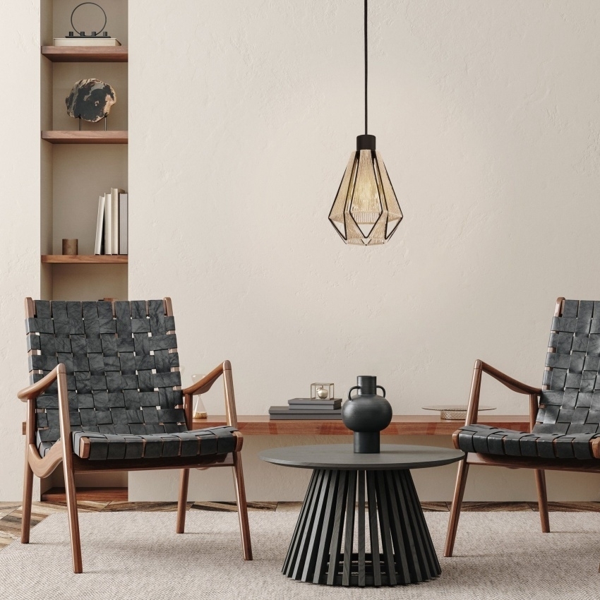 Závěsné svítidlo EGLO ADWICKLE zaujme moderním mixem kovu a přírodních materiálů. Jemné černé drátěné stínidlo ve tvaru diamantu je omotáno konopnou přízí v přírodním odstínu, což vytváří originální a útulný vzhled. Po rozsvícení svítidlo vytváří fascinující světelné efekty. Je ideální pro osvětlení jídelního stolu, obývacího pokoje nebo dalších obytných prostor. Žárovka není součástí balení.