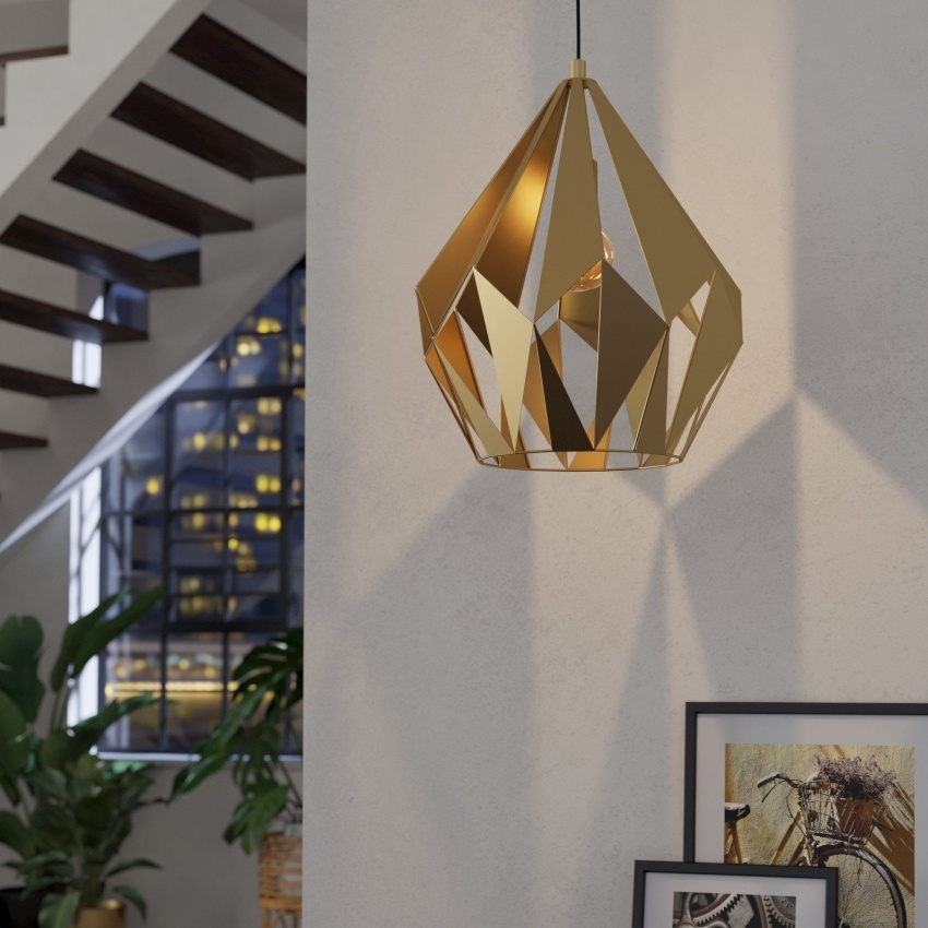 Moderní závěsné svítidlo EGLO CARLTON se zlatým kovovým stínidlem ve tvaru diamantu.