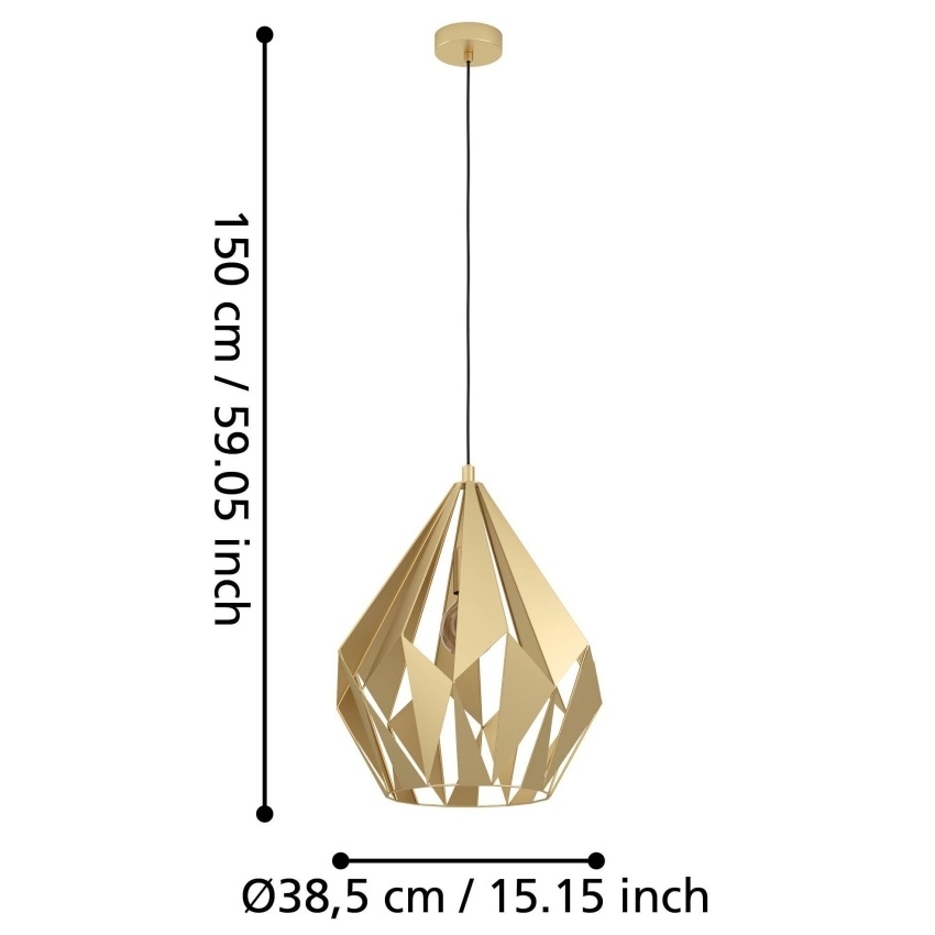 Závěsné svítidlo EGLO CARLTON zaujme elegantním designem se stínidlem ve tvaru diamantu v luxusní zlaté barvě. Geometrické otvory ve stínidle vytvářejí při rozsvícení působivé světelné efekty a dotvářejí příjemnou atmosféru interiéru. Svítidlo se hodí nad jídelní stůl, do obývacího pokoje, ložnice nebo vstupní haly. Žárovka není součástí balení, svítidlo je určeno pro patici E27 s maximálním výkonem 60 W.
