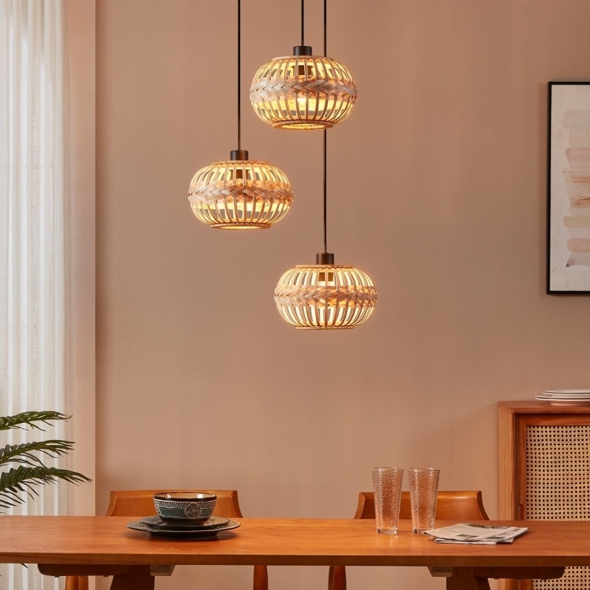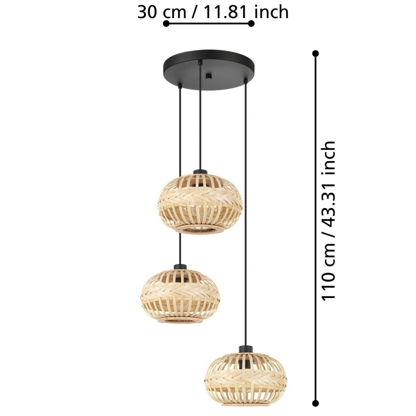 Závěsné svítidlo AMSFIELD 1 od EGLO spojuje přírodní bambusová proutěná stínidla s elegantním černým kovovým závěsem. Tři kulatá stínidla jsou zavěšena v různých výškách, což vytváří dynamický a stylový vzhled. Splétaná konstrukce bambusu při rozsvícení vytváří jedinečnou hru světla a stínů, která dodává interiéru útulnou a příjemnou atmosféru. Svítidlo se perfektně hodí do boho, vintage či skandinávského stylu a je ideální například nad kulatý jídelní stůl, do obývacího pokoje nebo kuchyně. Žárovky nejsou součástí balení a lze použít jakýkoliv typ s paticí E27.