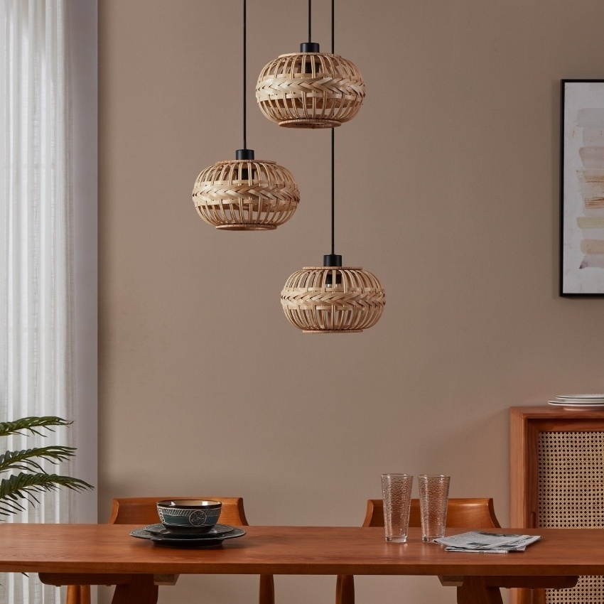 - Tři bambusová proutěná stínidla zavěšená v různých výškách