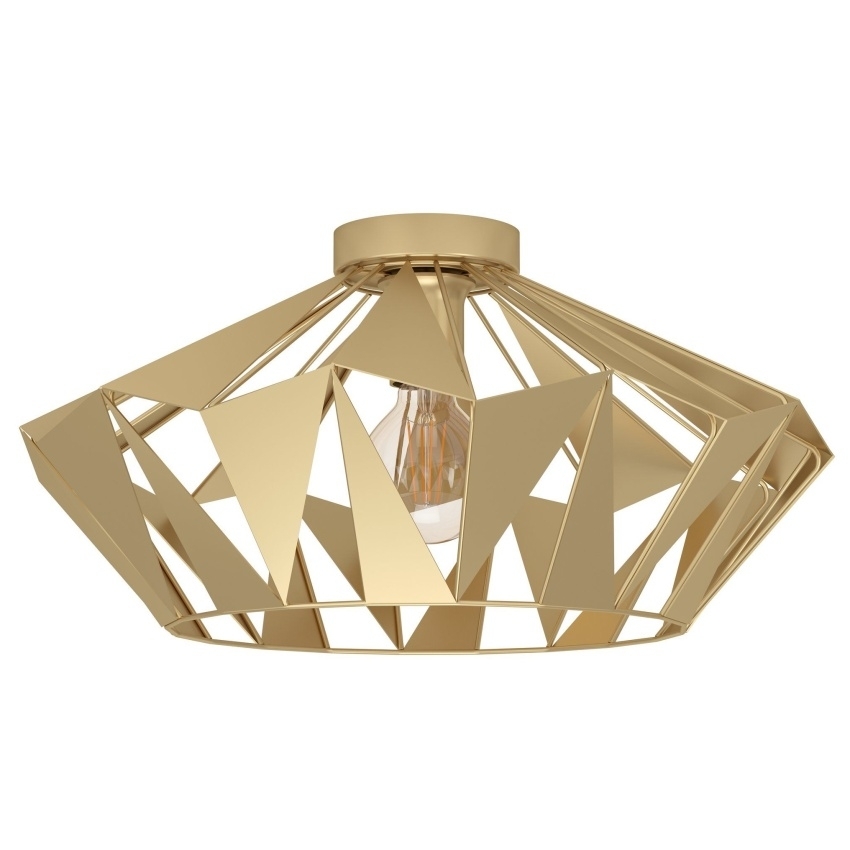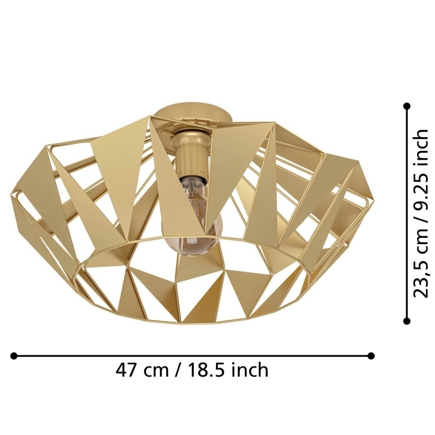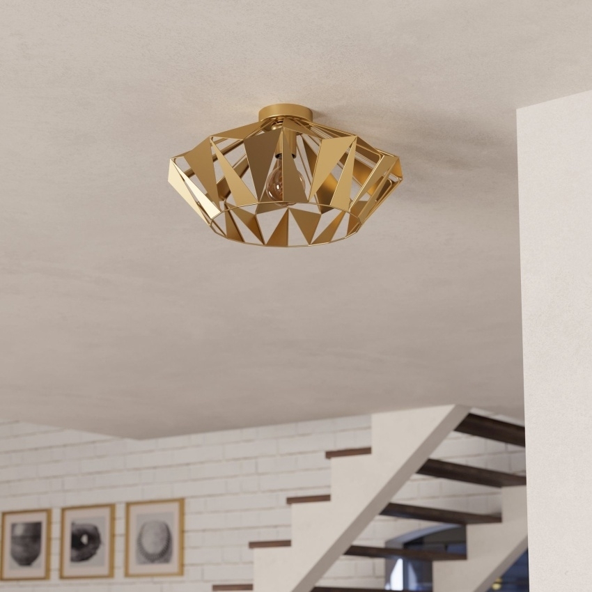 Stropní svítidlo CARLTON od EGLO zaujme svým elegantním designem s kovovým tělem ve tvaru diamantu v luxusním zlatém provedení. Geometrická konstrukce stínidla vytváří po rozsvícení jedinečnou hru světla a stínů, která dodá interiéru stylovou atmosféru. Svítidlo je ideální pro doplnění retro-chic interiérů a hodí se do obývacího pokoje, kuchyně, ložnice, chodby či jídelny. Žárovka není součástí balení a lze použít jakýkoliv typ s paticí E27.