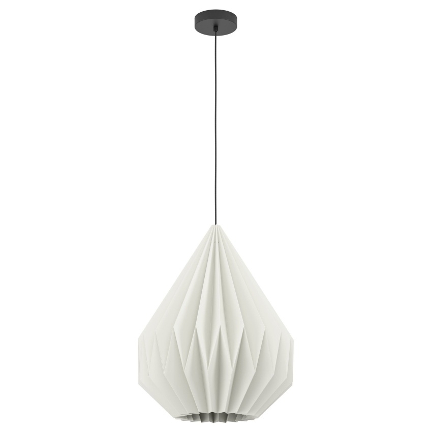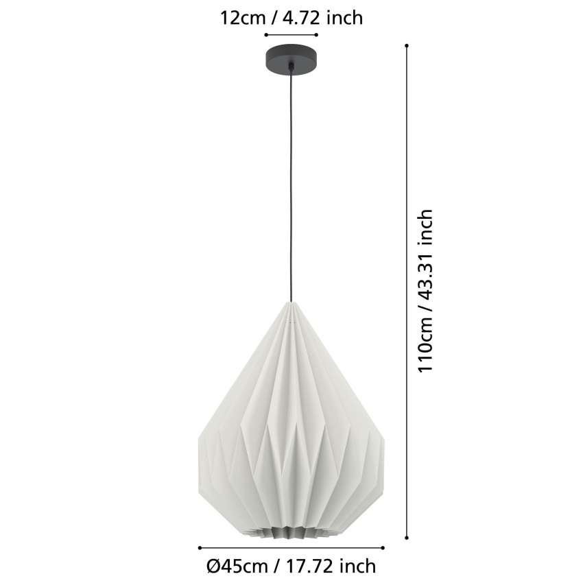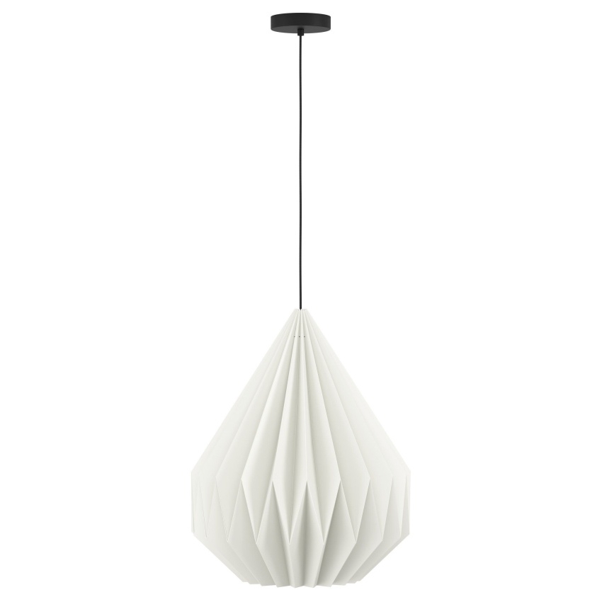 Závěsné svítidlo MINTING 43933 přináší do interiéru styl a jemnou eleganci. Velké stínidlo z bílého skládaného papíru ve tvaru slzy je doplněno černým kovovým závěsem, který vytváří moderní kontrast. Díky spodnímu otvoru stínidla s průměrem 45 cm je světlo směrováno přímo na stůl či plochu pod svítidlem. Toto svítidlo se skvěle hodí do kuchyní, obývacích pokojů nebo jídelen a dokonale doplní moderní i skandinávský styl interiéru. Je určeno pro žárovku s paticí E27 a maximálním výkonem 25 W, která není součástí balení, takže si můžete vybrat vhodný světelný zdroj podle svých potřeb.