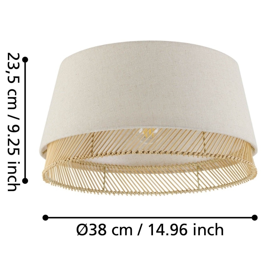 Stropní svítidlo TABLEY 43974 zaujme svou harmonickou kombinací přírodních materiálů a moderního designu. Lampa je vybavena dvěma zasazenými kulatými stínidly – vnější stínidlo je vyrobeno z lnu v přírodních tónech, zatímco vnitřní stínidlo tvoří jemná bambusová mřížka. Po rozsvícení vynikne přirozená struktura materiálů a svítidlo vytvoří příjemné, teplé osvětlení. Skvěle se hodí do obývacího pokoje, ložnice či chodby a perfektně doplní interiéry inspirované přírodou. Svítidlo je určeno pro jednu žárovku s paticí E27 a maximálním výkonem 40 W, která není součástí balení.