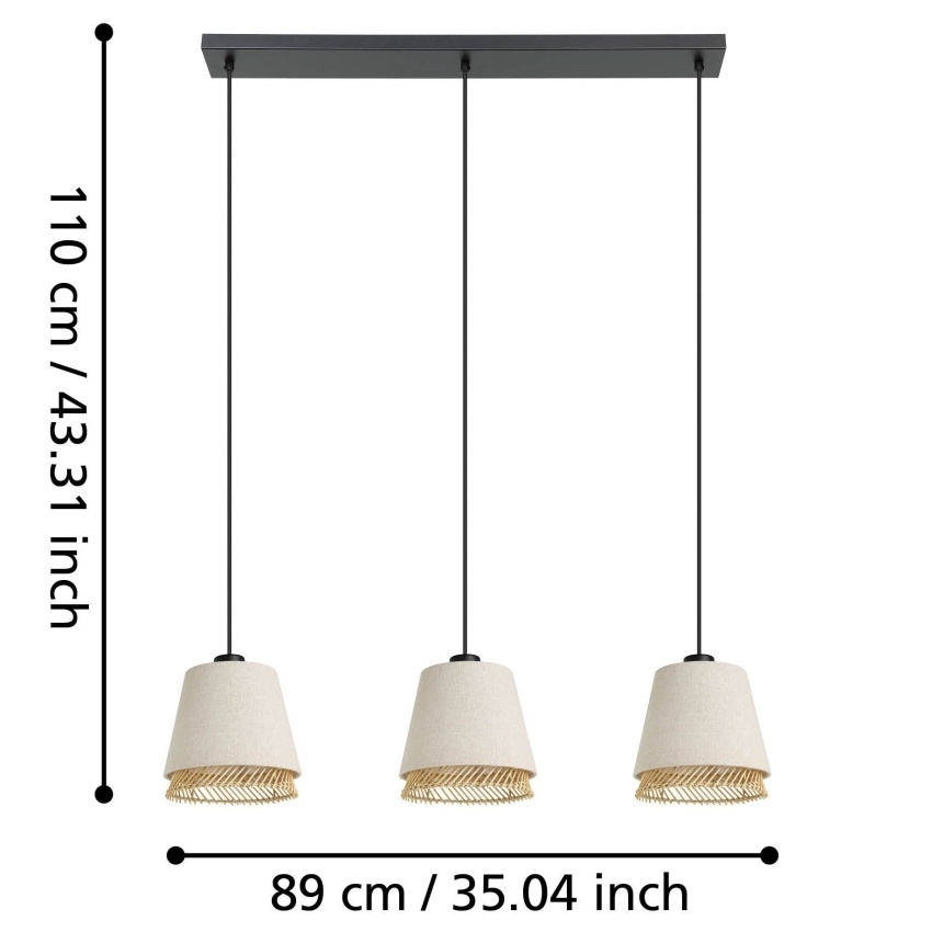 Závěsné svítidlo TABLEY 43976 přináší do interiéru harmonii a teplou atmosféru díky kombinaci přírodních materiálů a moderního designu. Každé z jeho tří stínidel se skládá ze dvou částí – vnější je z lněného materiálu v přírodních barvách a vnitřní tvoří jemná bambusová mřížka. Po rozsvícení se krásně zvýrazní struktura materiálů, což vytváří příjemné a útulné osvětlení. Lampa je ideální pro umístění nad podlouhlý jídelní stůl nebo jako výrazný prvek v obývacím pokoji. Svítidlo je určeno pro tři žárovky s paticí E27 a maximálním výkonem 3×40 W, které nejsou součástí balení.