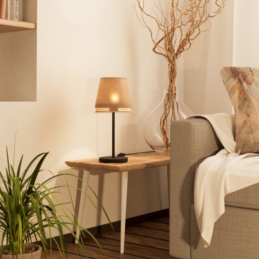 Stolní lampa TABLEY 43977 spojuje moderní design s přírodními materiály, čímž vytváří teplou a příjemnou atmosféru. Lampa je vybavena dvěma zasazenými kulatými stínidly – vnější je vyrobeno z lnu v přírodních barvách, zatímco vnitřní tvoří jemná bambusová mřížka. Po rozsvícení vynikne přirozená struktura materiálů a světlo působí měkce a příjemně. Díky praktickému vypínači na kabelu je ovládání snadné a pohodlné. Lampa se hodí do ložnice na noční stolek, do obývacího pokoje, jídelny i na chodbu. Je určena pro žárovku s paticí E27 a maximálním výkonem 40 W, která není součástí balení.