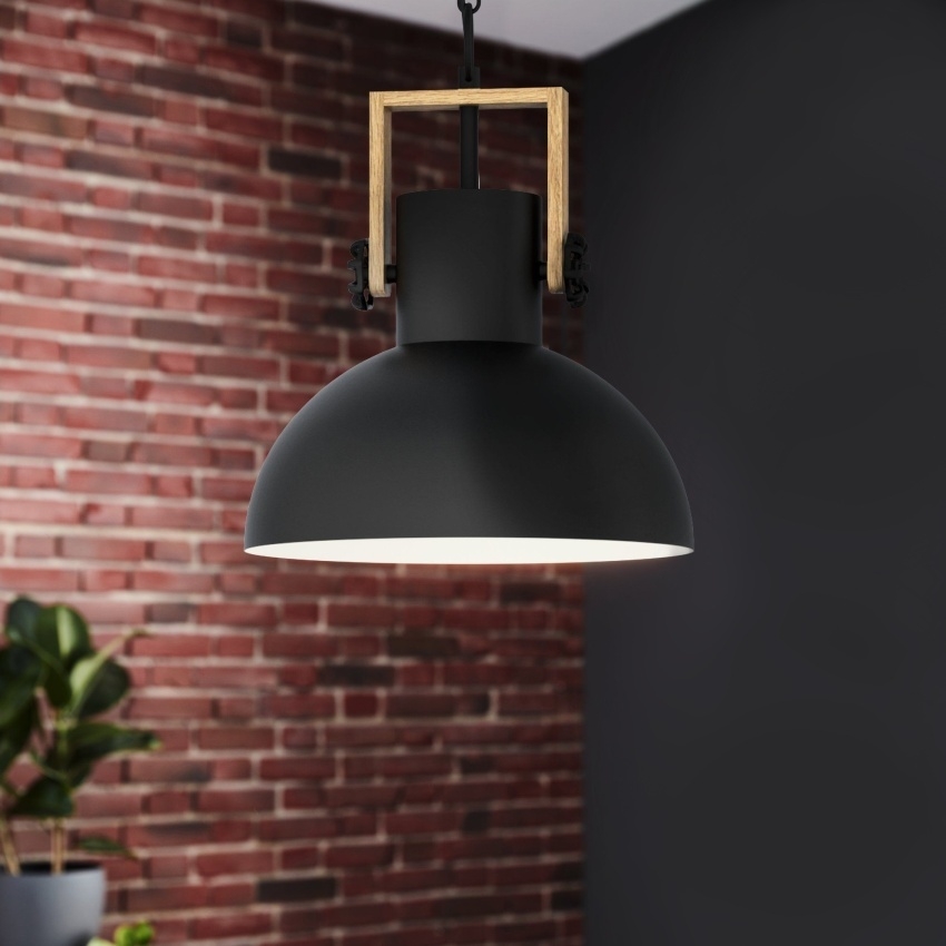 Závěsné svítidlo EGLO LUBENHAM 44056 v kombinaci černého kovu a přírodního dřeva, ideální pro moderní interiéry s industriálním nádechem.