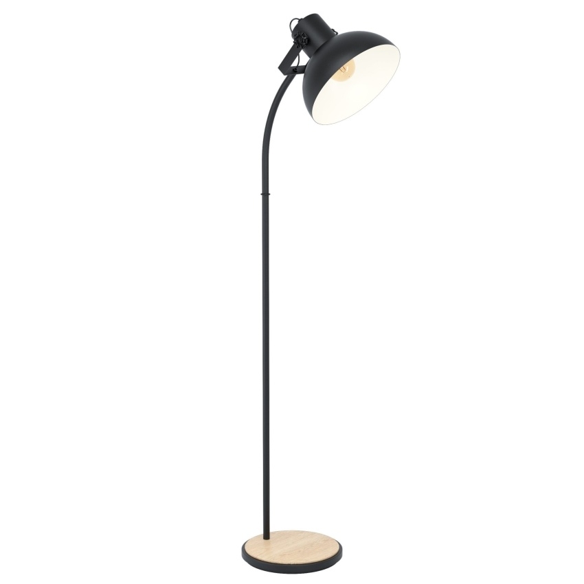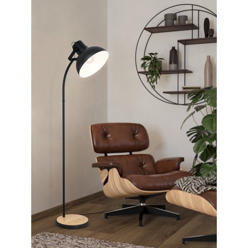 Stojací svítidlo EGLO LUBENHAM 44059 s elegantní kombinací černého kovu a hnědého dřeva, ideální pro moderní i industriální interiéry.