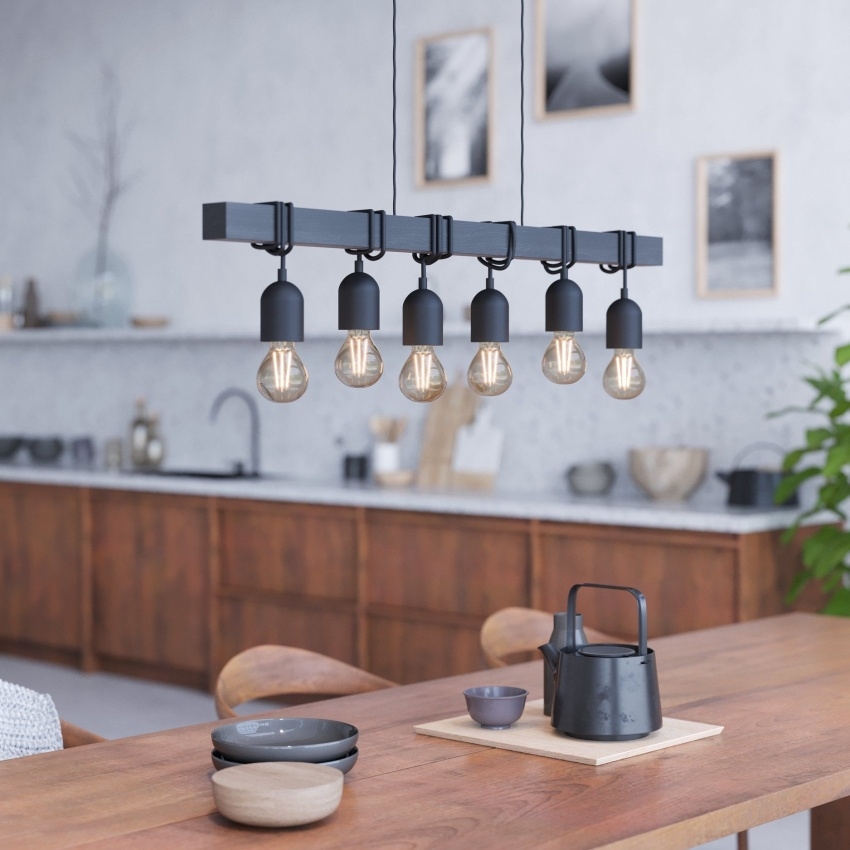 Závěsné svítidlo EGLO TOWNSHEND 44062 s šesti paticemi E27 a stylovou kombinací černého kovu a dřeva, ideální pro moderní i industriální interiéry.