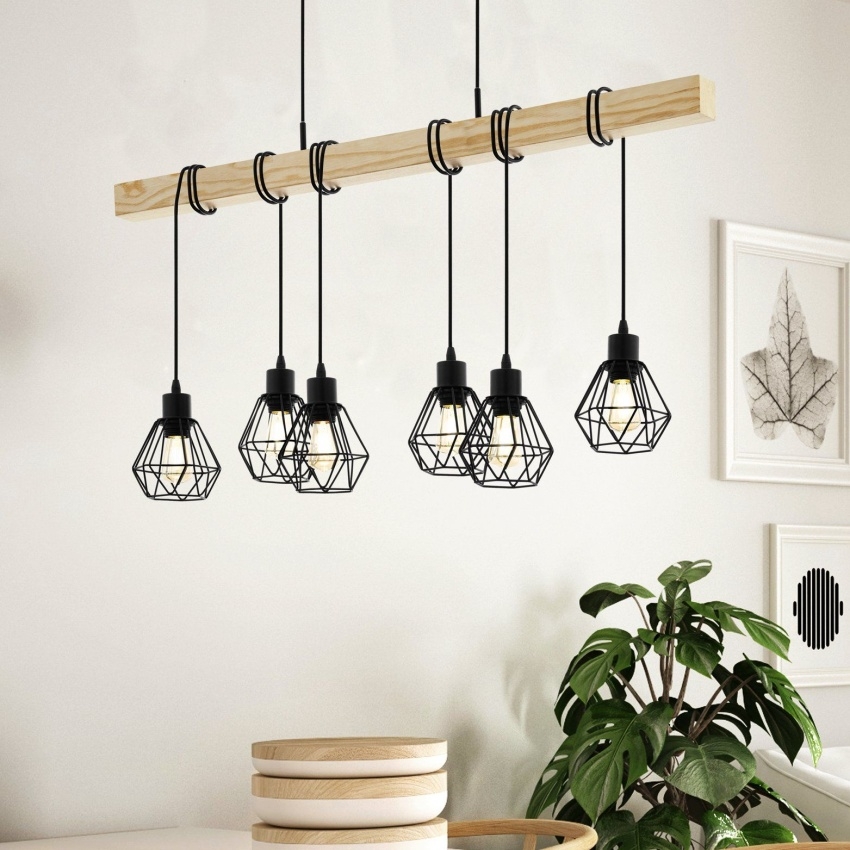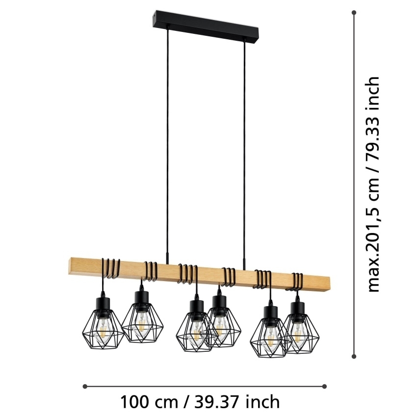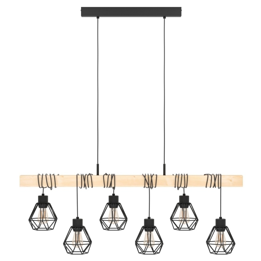 Závěsné svítidlo TOWNSHEND 5 44076 zaujme svým moderním industriálním designem, který spojuje robustní černý kov s přírodním FSC certifikovaným dřevem borovice. Šest patic E27 poskytuje dostatek světla i pro větší místnosti, jako je jídelna, obývací pokoj nebo kuchyně. Otevřený design svítidla umožňuje vyniknout dekorativním žárovkám, které nejsou součástí balení, což vám dává volnost při výběru stylu i intenzity osvětlení. Díky kombinaci přírodních a moderních materiálů je svítidlo nejen praktickým zdrojem světla, ale i výrazným dekorativním prvkem interiéru.