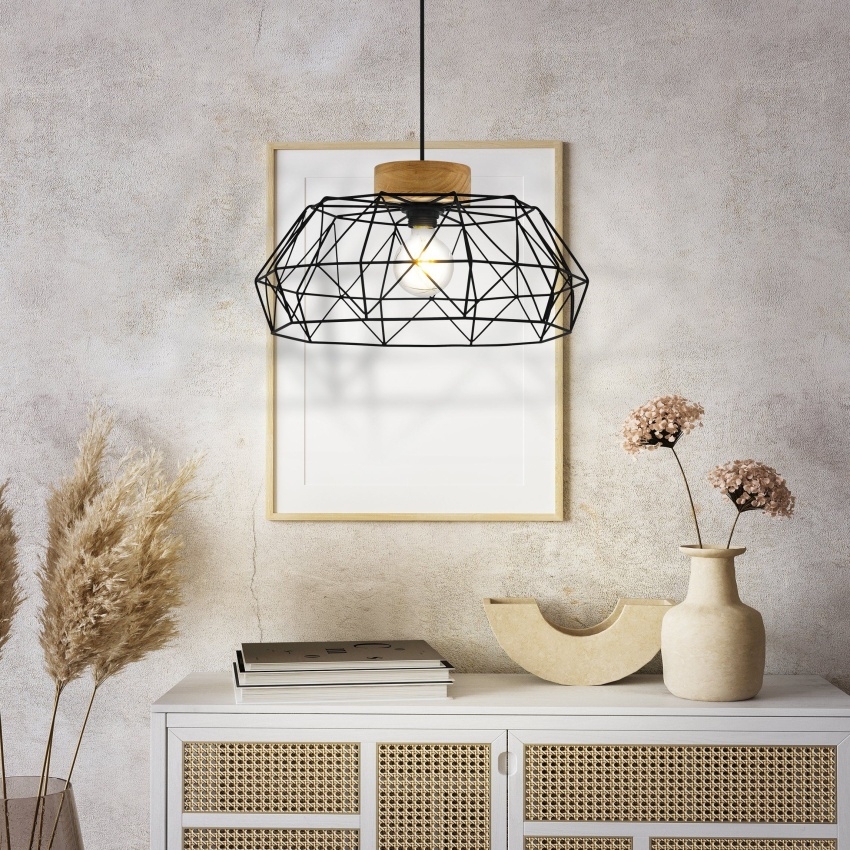 Závěsné svítidlo PADSTOW 44089 spojuje moderní industriální design s přírodními prvky. Konstrukce z černé oceli je doplněna FSC certifikovaným dřevem gumovníku, což dodává svítidlu příjemný kontrast a útulný vzhled. Otevřený design stínidla umožňuje využití dekorativní žárovky, která zároveň slouží jako výrazný estetický prvek. Svítidlo je ideální pro osvětlení jídelního stolu, obývacího pokoje, kuchyně nebo chodby. Je určeno pro jednu žárovku s paticí E27 a maximálním výkonem 60 W, která není součástí balení.