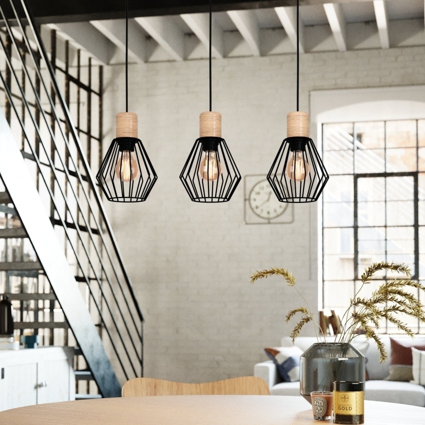Závěsné svítidlo EGLO PALMORLA 44094 v elegantním industriálním stylu, který kombinuje černý kov a přírodní dřevo, ideální pro moderní interiéry.