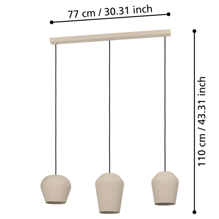 Moderní závěsné svítidlo EGLO CAMBAITO se třemi kovovými stínidly v pískové barvě, ideální pro osvětlení jídelny nebo obývacího pokoje.