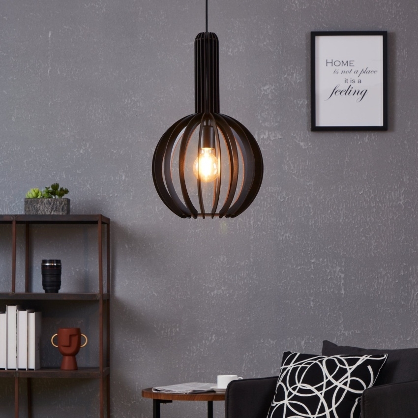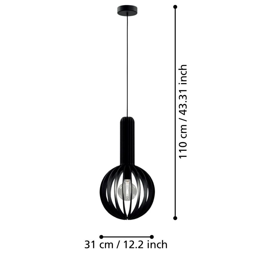 Stylové závěsné svítidlo EGLO VELASCO s kulovým stínidlem z černých dřevěných lamel pro moderní interiéry.