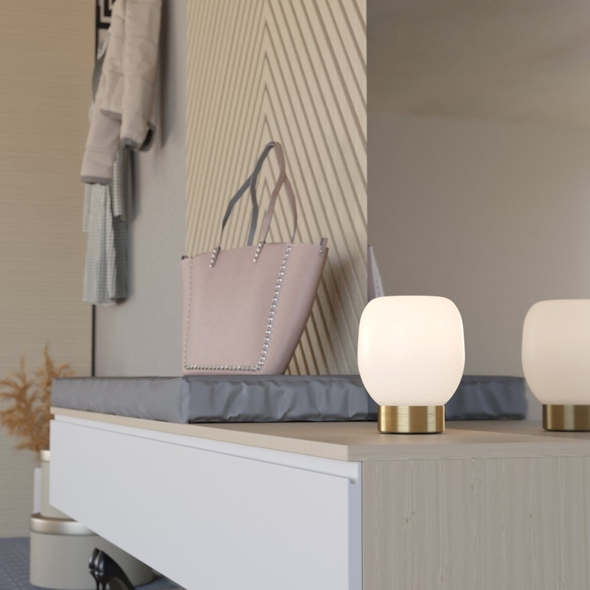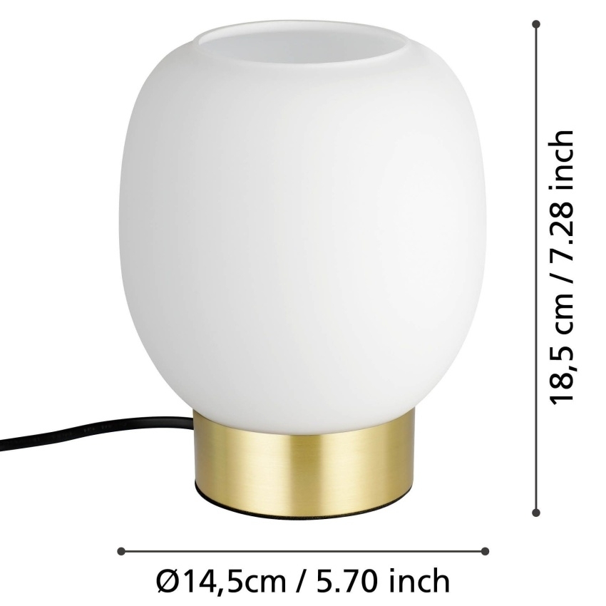 Stolní lampa MANZANARES je navržena s důrazem na eleganci a jednoduchost. Kombinuje kulatou kovovou základnu z broušené mosazi s jemně zaobleným stínidlem z bílého opálového matného skla. Díky svému decentnímu designu se hodí do široké škály interiérů a poskytuje příjemné, měkké osvětlení. Ovládání je snadné pomocí vypínače umístěného na kabelu. Žárovka není součástí balení, takže si můžete vybrat světelný zdroj podle vlastních preferencí.