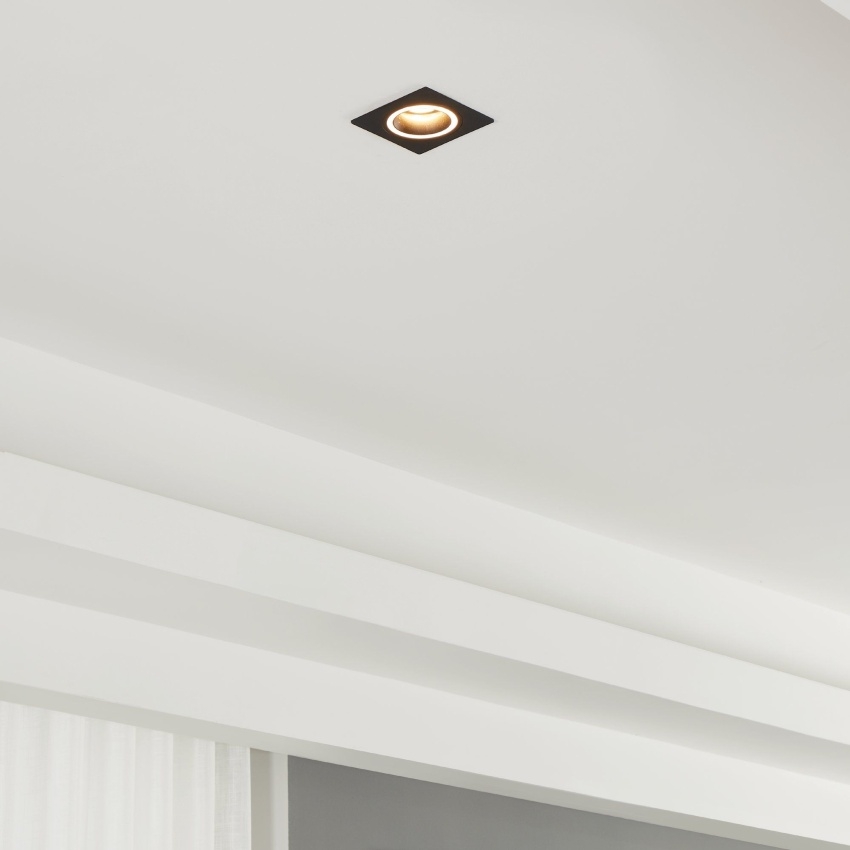 Vestavné svítidlo CAROSSO je vyrobeno z černého hliníku a doplněno bílým plastovým kroužkem. Díky minimalistickému a nadčasovému designu se hodí do různých typů interiérů, jako je kuchyně, obývací pokoj, ložnice či předsíň. Svítidlo je určeno pro montáž do stropu a vyžaduje výřez o průměru 80 mm. Montážní hloubka závisí na použitém světelném zdroji. Vhodné pro žárovku s paticí GU10, která není součástí balení.