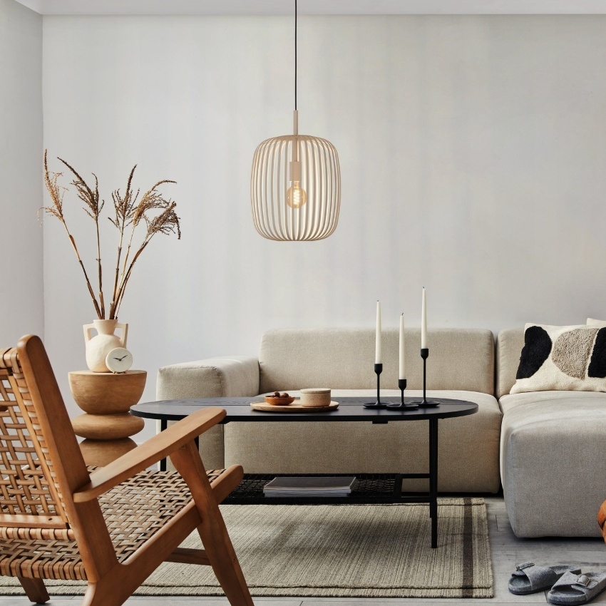 Závěsné svítidlo ROMAZZINA zaujme svým kulatým stínidlem, které je vyrobeno z plochých kovových pásků v pískové barvě. Po rozsvícení vytváří zajímavé hry světla a stínu, které dodají interiéru jedinečnou atmosféru. Díky svému designu v duchu New Nordic se hodí do moderních interiérů a najde uplatnění nad jídelním stolem, v obývacím pokoji nebo v kuchyni. Žárovka není součástí balení, svítidlo je kompatibilní s paticí E27.