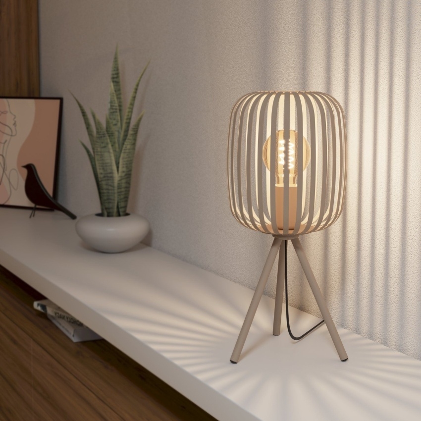 Moderní stolní svítidlo EGLO ROMAZZINA v pískové barvě s kovovým stínidlem a třínohým podstavcem, vhodné pro žárovku E27.