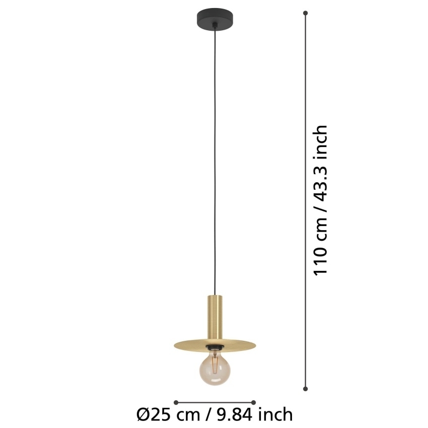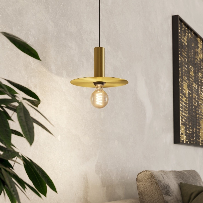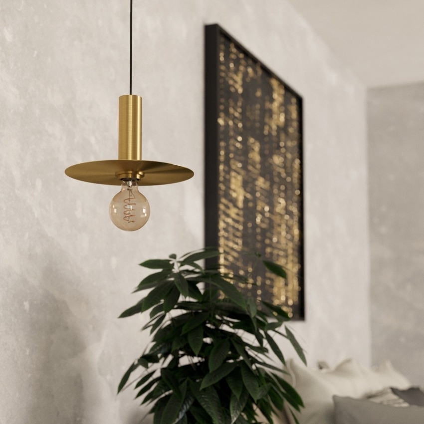 Závěsné svítidlo EGLO ESCANDELL zaujme svým minimalistickým a nadčasovým designem. Je tvořeno kulatým kovovým kotoučem v provedení broušené mosazi, který je zavěšen na černém vrchlíku. Uprostřed kotouče se nachází objímka pro světelný zdroj směřující dolů, což vytváří příjemné a přímé osvětlení. Svítidlo se hodí do moderních interiérů, ale i do prostor ve stylu „New Retro“. Ideální je například nad jídelní stůl nebo jako stylový prvek v obývacím pokoji. Pro ještě výraznější efekt se doporučuje použít dekorativní spirálovou žárovku v jantarové barvě. Žárovka není součástí balení.