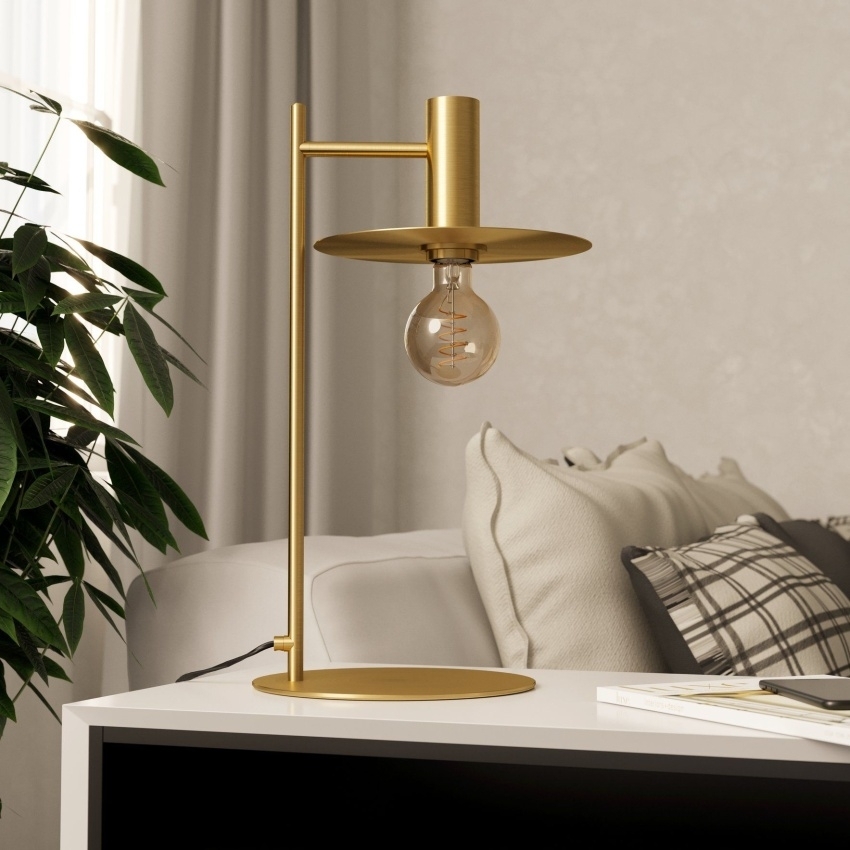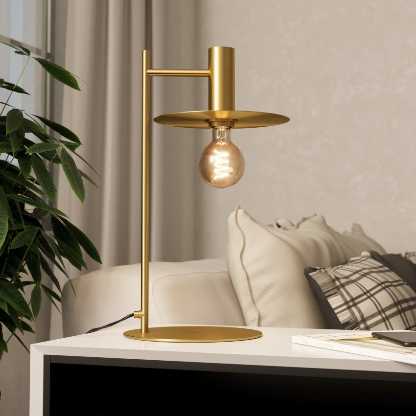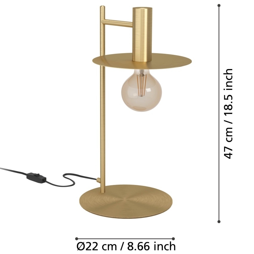 Stolní svítidlo EGLO ESCANDELL přináší do interiéru nadčasovou eleganci a minimalistický design. Je vyrobeno z kulatého kovového kotouče v provedení broušené mosazi, který je upevněn na stabilní základně ve stejné barvě. Uprostřed kotouče se nachází objímka pro světelný zdroj směřující dolů, což vytváří příjemné přímé osvětlení. Svítidlo lze jednoduše zapínat a vypínat pomocí vypínače umístěného na kabelu. Díky svému stylovému vzhledu se hodí na noční stolek, komodu, pracovní stůl či jako dekorativní prvek do obývacího pokoje. Žárovka není součástí balení, což vám umožňuje zvolit světelný zdroj dle vlastních preferencí – ideálně dekorativní spirálovou žárovku v jantarové barvě.