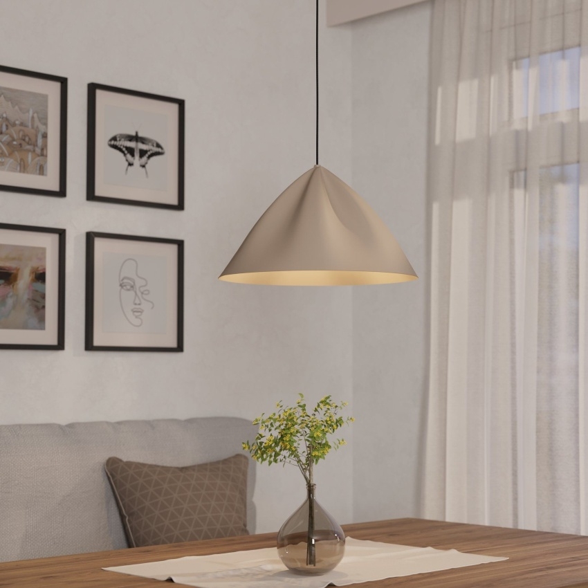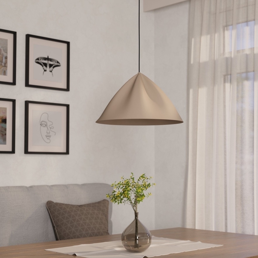 Závěsné svítidlo EGLO PODERE vyniká moderním designem Japandi, který kombinuje minimalistickou eleganci s přírodními prvky. Je tvořeno kónickým kovovým stínidlem v pískové barvě s dekorativními vlnkami, které vytvářejí jemný světelný efekt. Svítidlo je doplněno kovovým závěsem ve stejné barvě a textilním kabelem. Skvěle se hodí nad jídelní stůl, do obývacího pokoje nebo dalších obytných prostor. Žárovka s paticí E27 není součástí balení, což vám umožní zvolit si světelný zdroj dle vlastních preferencí.