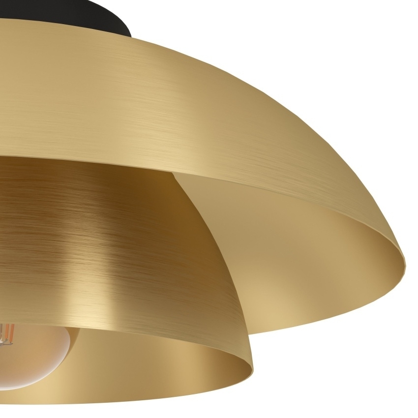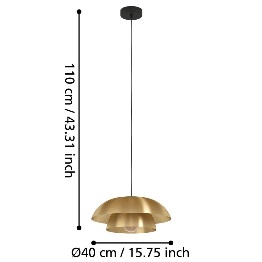 Závěsné svítidlo EGLO CENCIARA přináší do interiéru nádech luxusu a elegance. Tvoří jej dvě vnořená kulatá kovová stínidla z broušené mosazi s vnitřní zlatou povrchovou úpravou, která zajišťuje příjemné nepřímé osvětlení. Díky otvoru na vnitřním stínidle je světlo rozptýlené a vytváří útulnou atmosféru. V kombinaci s černým kovovým vrchlíkem působí svítidlo stylově a stává se výrazným designovým prvkem. Skvěle se hodí nad jídelní stůl, do obývacího pokoje nebo dalších moderních prostor. Žárovka s paticí E27 není součástí balení.