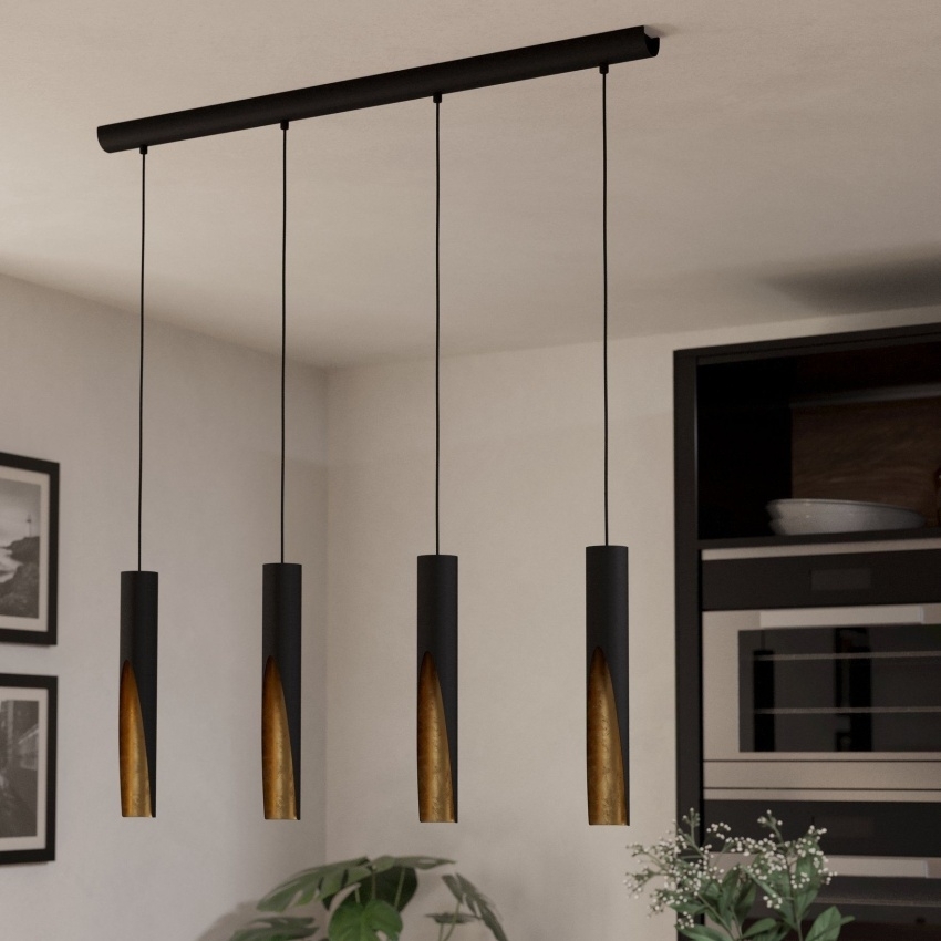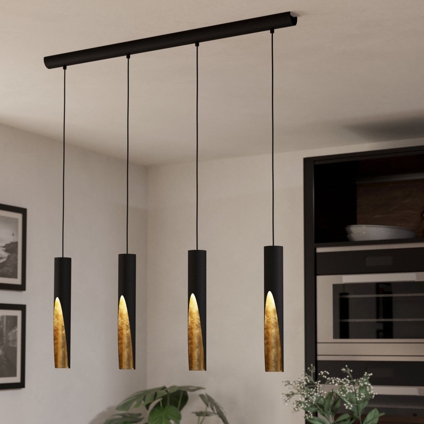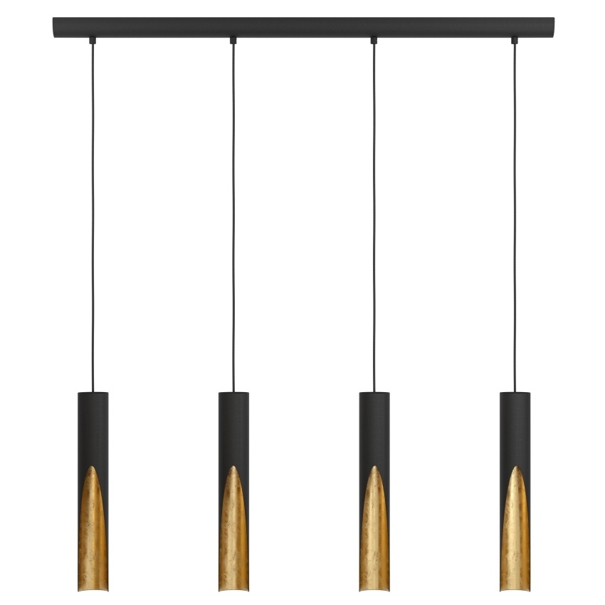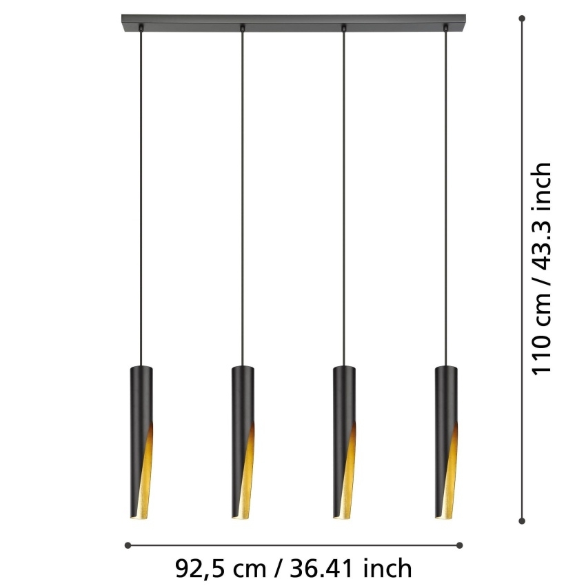 Závěsné svítidlo EGLO BARBOTTO 900873 zaujme svým elegantním a moderním designem. Je tvořeno čtyřmi štíhlými kovovými trubicemi v černé barvě se zlatými vnitřky, které vyzařují příjemné teplé bílé světlo. Díky zkoseným spodním okrajům je z vnější strany patrný luxusní zlatý vnitřek, který dodává svítidlu jedinečný vzhled. Toto svítidlo je ideální pro osvětlení jídelního stolu, obývacího pokoje či jiných moderních interiérů. Součástí balení jsou LED žárovky s paticí GU10.