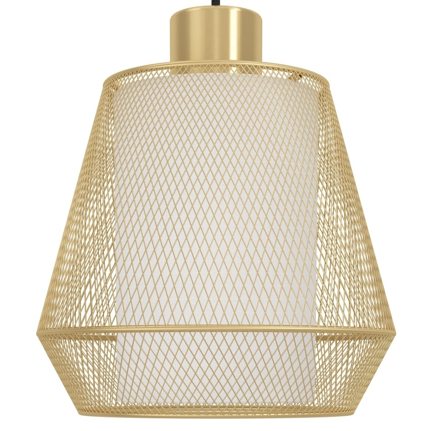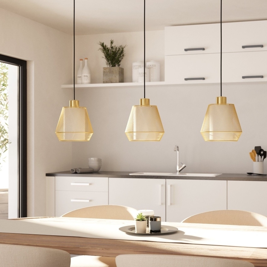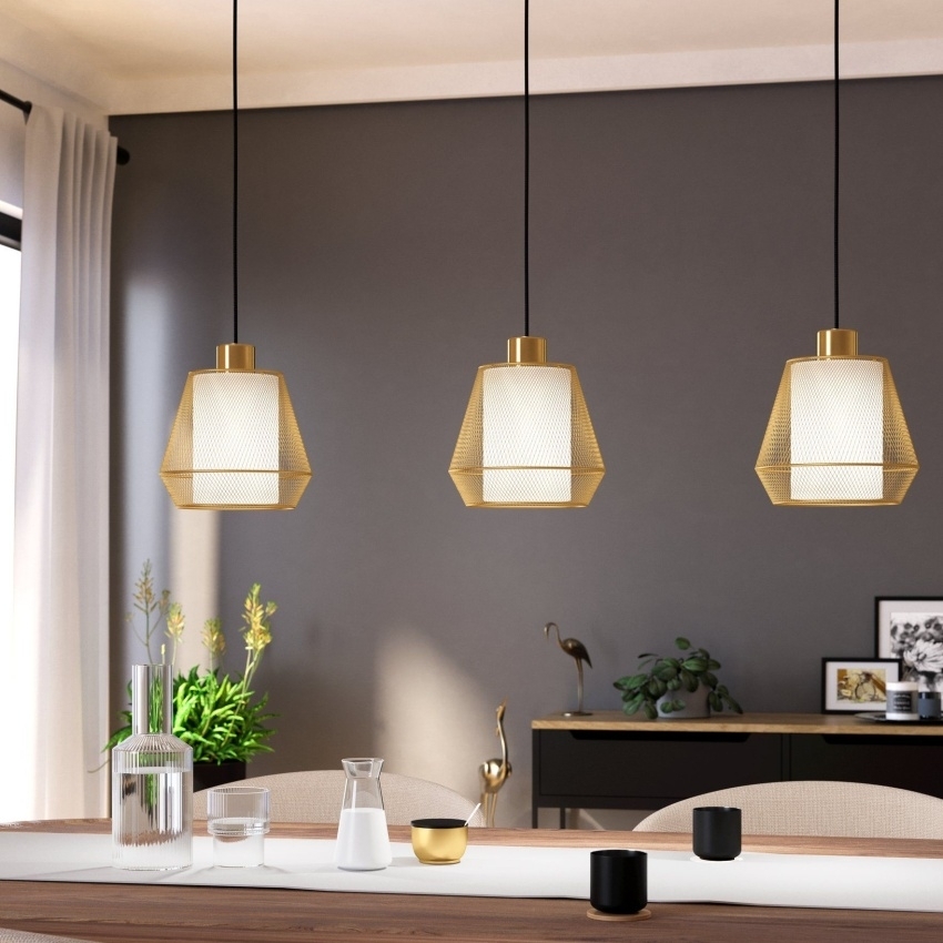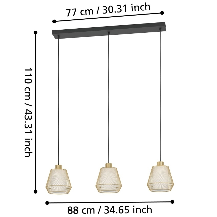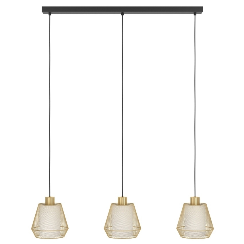 Závěsné svítidlo EGLO CIUDADELA 900897 spojuje moderní design s elegantními materiály. Skládá se ze tří kovových drátěných stínidel ve tvaru diamantu v mosazné barvě, uvnitř kterých se nachází bílé textilní válečky zajišťující příjemné a rovnoměrné rozptýlení světla. Po rozsvícení vytvářejí stínidla působivé hry světla a stínu, které dodají interiéru jedinečnou atmosféru. Svítidlo je ideální nad jídelní stůl, do obývacího pokoje či dalších moderně zařízených prostor. Žárovky nejsou součástí balení, použít lze jakékoliv s paticí E27.