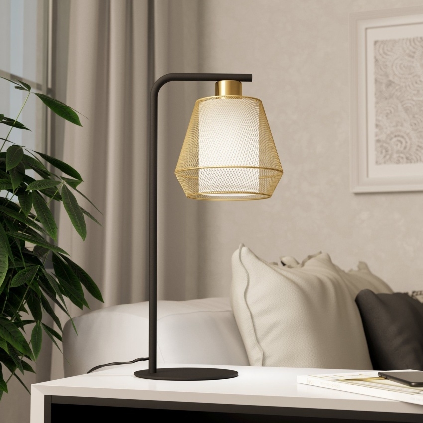 Stolní svítidlo EGLO CIUDADELA 900898 kombinuje moderní design s elegantními materiály. Vnější stínidlo je vyrobeno z kovu v mosazné barvě a má tvar kosočtverce, uvnitř se nachází bílý textilní váleček, který zajišťuje příjemné a rovnoměrné osvětlení. Svítidlo je doplněno černou kovovou základnou a ovládá se jednoduše pomocí vypínače na kabelu. Po rozsvícení vytváří drátěná konstrukce působivé světelné efekty, které dodají interiéru jedinečnou atmosféru. Žárovka není součástí balení, použít lze jakoukoliv s paticí E27.