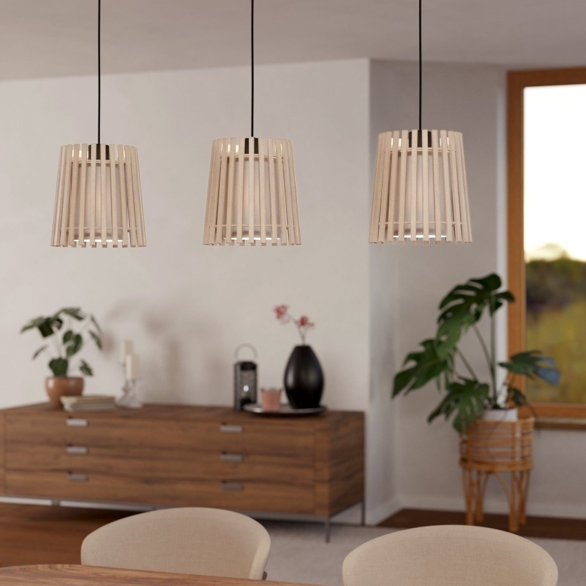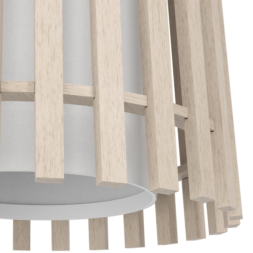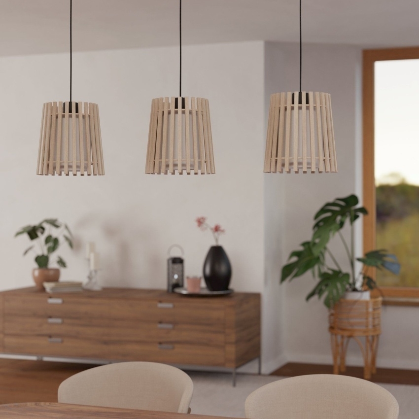 Závěsné svítidlo EGLO FATTORIA 900903 přináší do interiéru přírodní vzhled a útulnou atmosféru. Skládá se ze tří stínidel, z nichž každé je tvořeno dvěma vnořenými částmi – vnější část je vyrobena ze světlého pravého dřeva a vnitřní z bílého textilu. Stínidla jsou zavěšena na třech černých textilních kabelech, které jsou upevněny k podlouhlému kovovému přístřešku ve stejné barvě. Po rozsvícení vytváří svítidlo působivé hry světla a stínu, které oživí jídelnu nebo obývací prostor. Žárovky nejsou součástí balení, použít lze jakékoliv s paticí E27. Pro rovnoměrné osvětlení se doporučují žárovky z opálového skla.