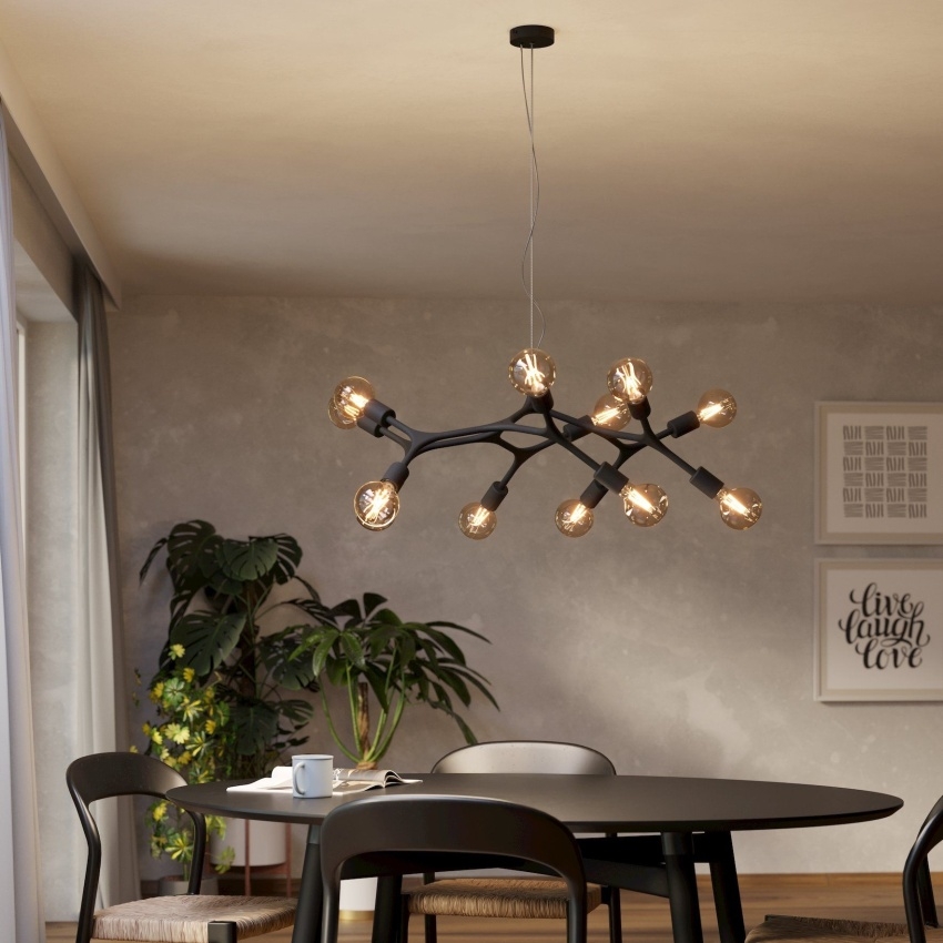 Závěsné svítidlo EGLO BOCADELLA 98347 je výrazný lustr v moderním stylu, který zaujme svou originalitou a nespoutaným designem. Je vyrobeno z černé oceli a nabízí prostor pro 12 žárovek s paticí E27 do výkonu 60W (nejsou součástí balení). Svítidlo tak umožňuje vytvořit výrazný světelný efekt, který si můžete doladit výběrem dekorativních žárovek. Díky průměru 92 cm a maximální výšce 1100 mm se hodí především nad jídelní stůl, do obývacího pokoje, ložnice, haly nebo na schodiště, kde se stane dominantním prvkem interiéru.