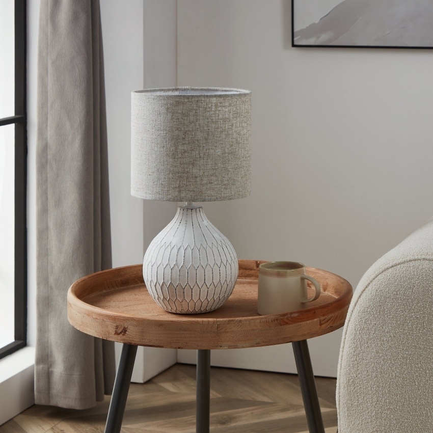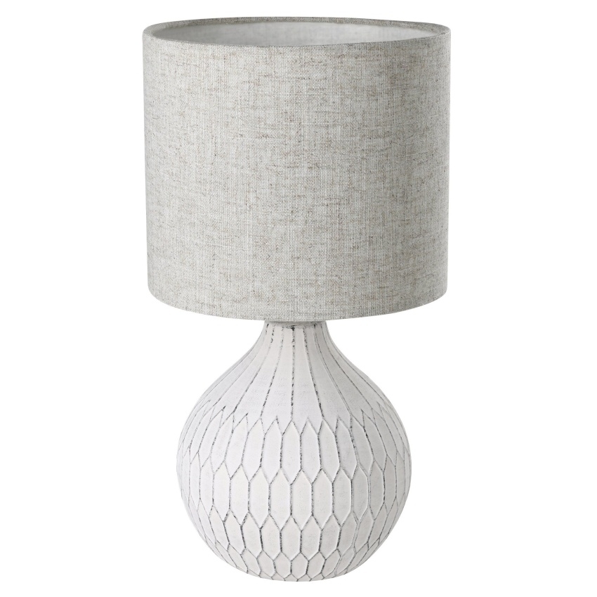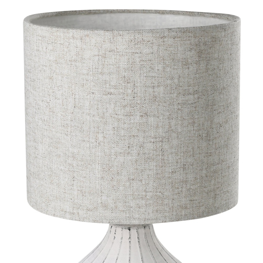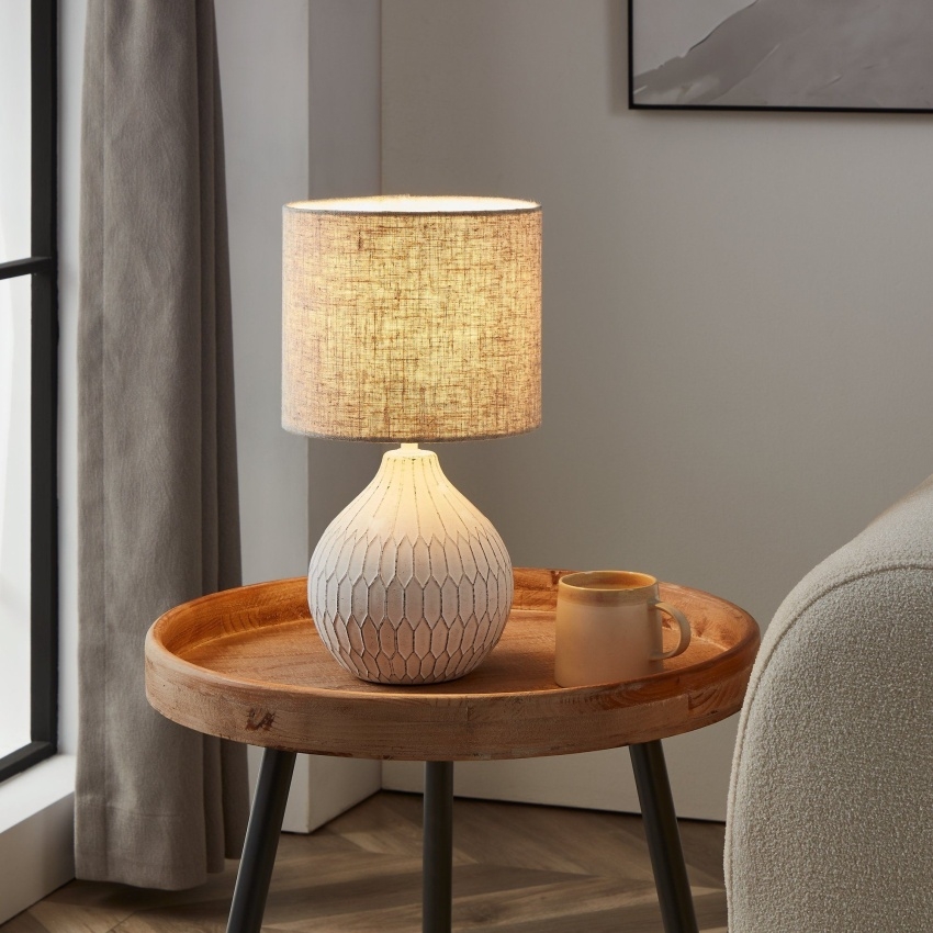 - Elegantní kombinace bílé keramiky a světle hnědého textilního stínidla