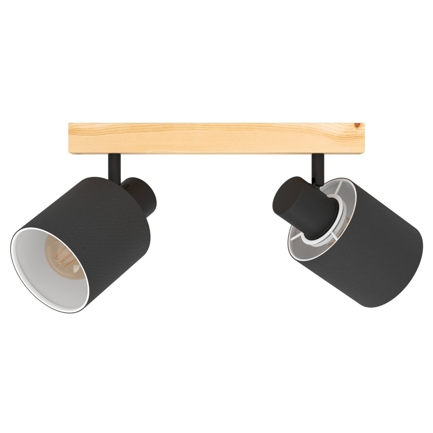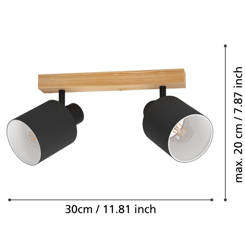 Stropní bodové svítidlo EGLO BATALLAS 99489 z kombinace hnědého dřeva, černého kovu a textilních stínidel v černo-bílé barvě pro dvě žárovky E27.