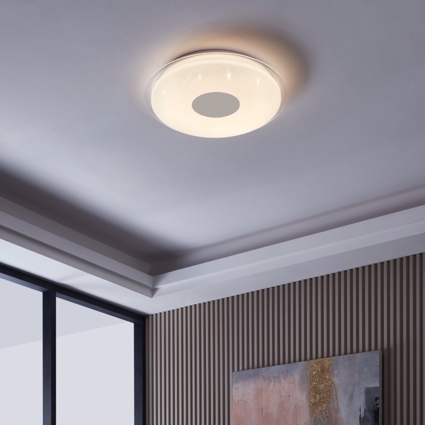 Svítidlo EGLO LANCIANO-Z 900005 je moderní LED stropní osvětlení s průměrem 56 cm, které zaujme elegantním bílým designem a třpytivým efektem difuzoru. Nabízí výkon 4x11,2 W a světelný tok 4960 lm, což zajišťuje intenzivní a rovnoměrné osvětlení i větších prostor. Díky funkci CCT lze měnit teplotu světla od teplé 2700 K přes neutrální až po studenou 6500 K, takže si snadno nastavíte atmosféru podle aktuální potřeby. Svítidlo je součástí systému EGLO Connect a lze jej ovládat pomocí dálkového ovladače nebo mobilní aplikace.