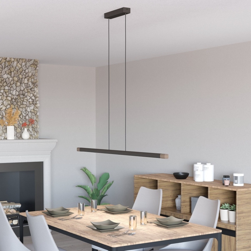 Svítidlo EGLO LISCIANA 900175 je elegantní závěsné LED osvětlení v moderním lineárním designu. Tělo tvoří hliníkový profil v šedé barvě, který je doplněn o koncovky z masivního dřeva gumovníku ve vzhledu ořechu. Černé textilní kabely a kovová stříška podtrhují jeho stylový vzhled. Integrovaný LED zdroj o výkonu 22 W poskytuje světelný tok 2500 lm a příjemné teplé bílé světlo o teplotě 3000 K. Svítidlo je stmívatelné pomocí vhodného nástěnného stmívače a díky své délce 126 cm je ideální pro osvětlení jídelního stolu nebo delší pracovní plochy v moderních interiérech.
