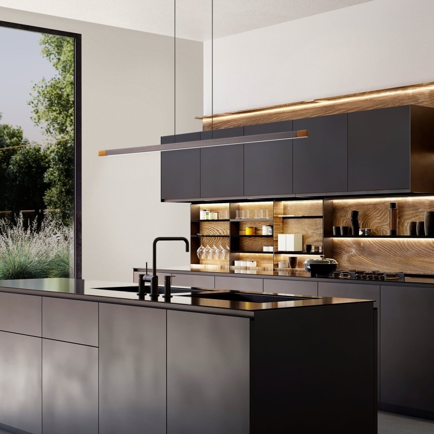 - Kombinace šedého kovu a dřevěných detailů ve vzhledu ořechu