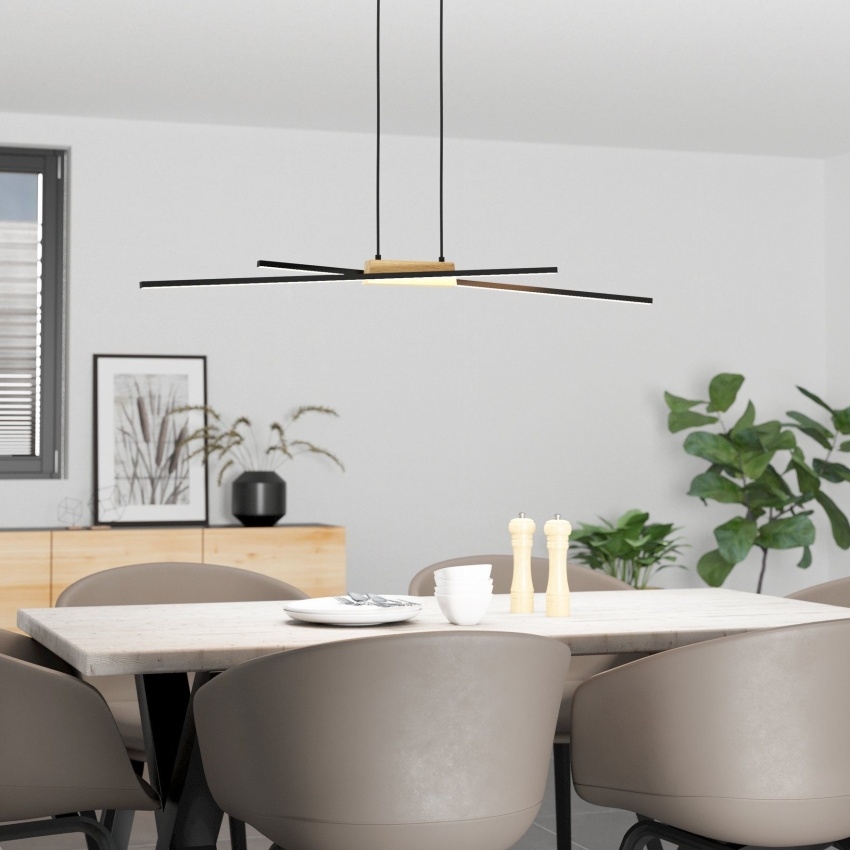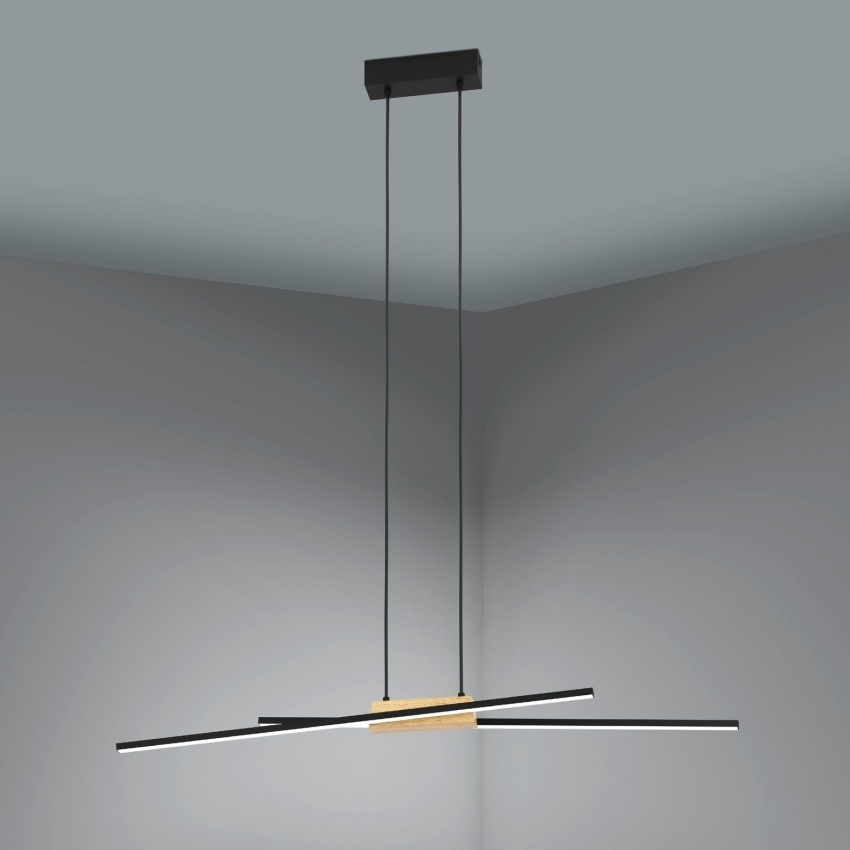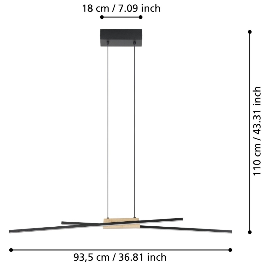 Závěsné LED svítidlo EGLO PANAGRIA 900489 v kombinaci černého kovu a dřeva, 2×13 W, 3120 lm, teplá bílá 3000 K, stmívatelné.